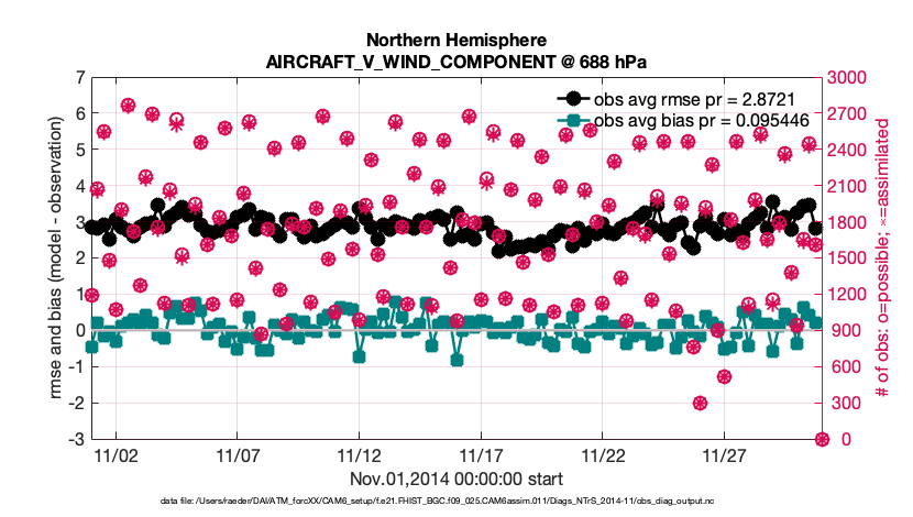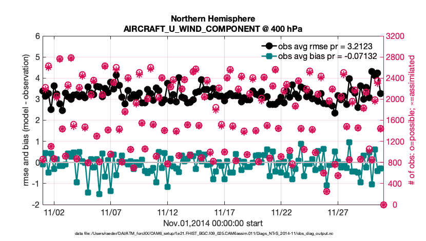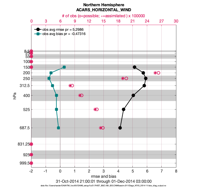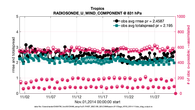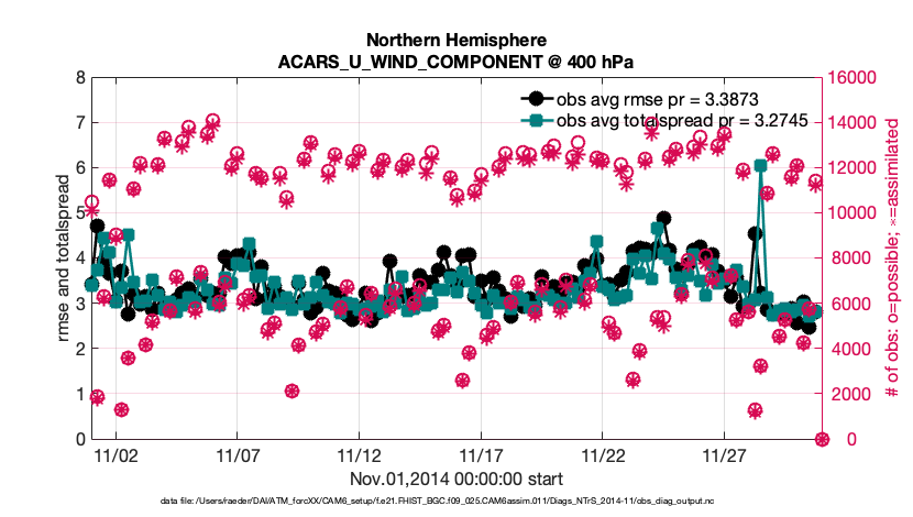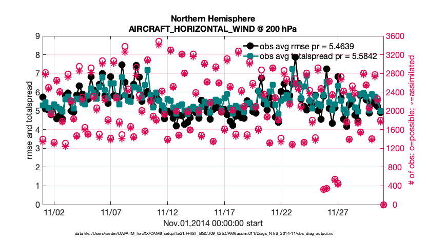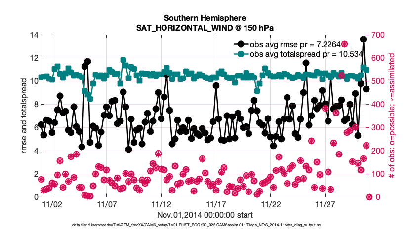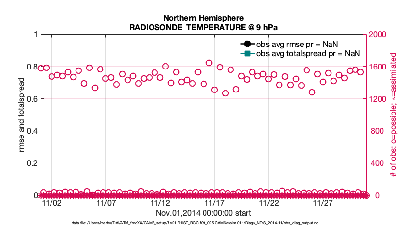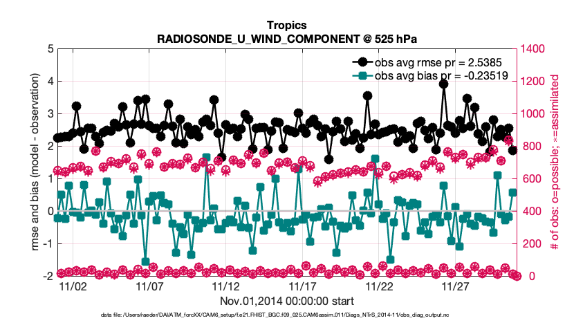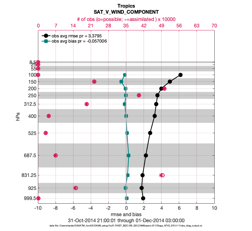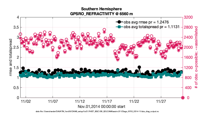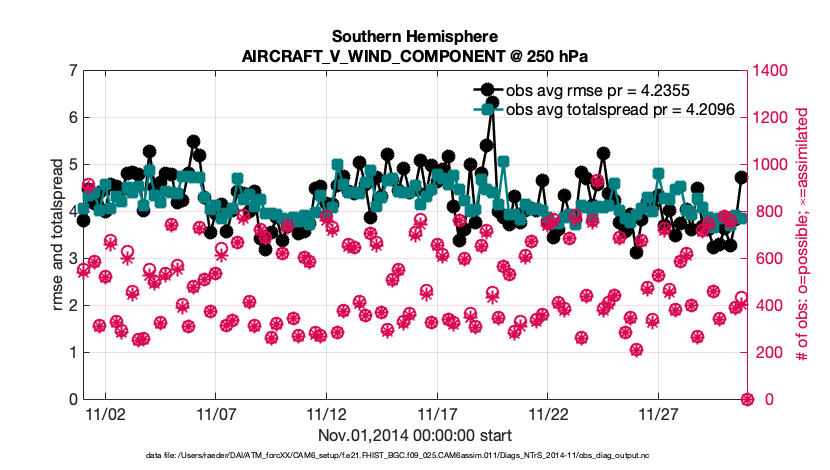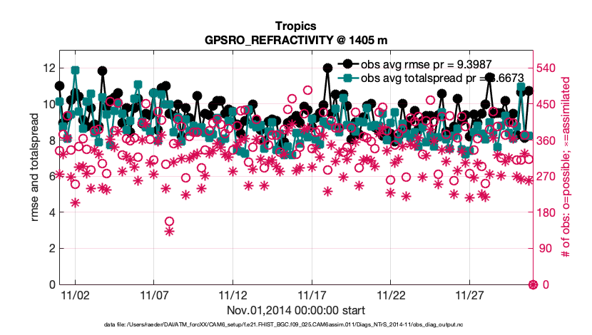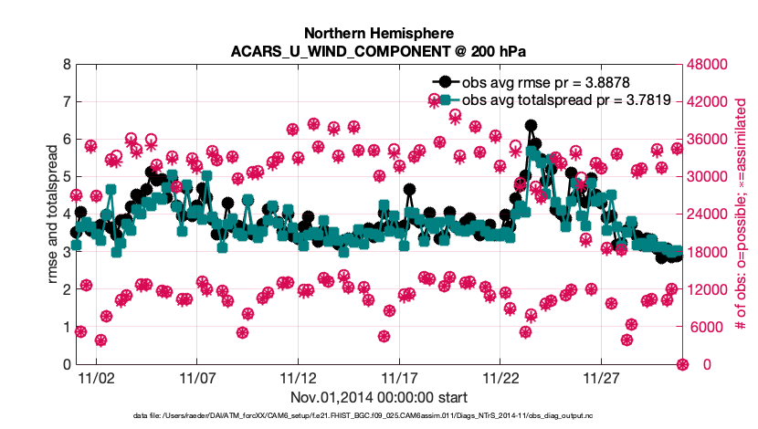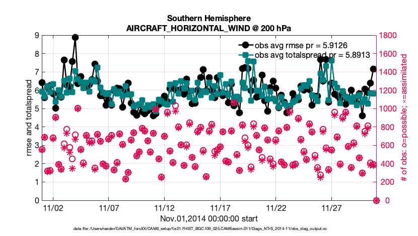 For each observation kind, the root-mean-squared-error (RMSE) is plotted together with: (i) BIAS and (ii) TOTALSPREAD. The number of available, assimilated (evaluated) and rejected observations are also shown on the plots.