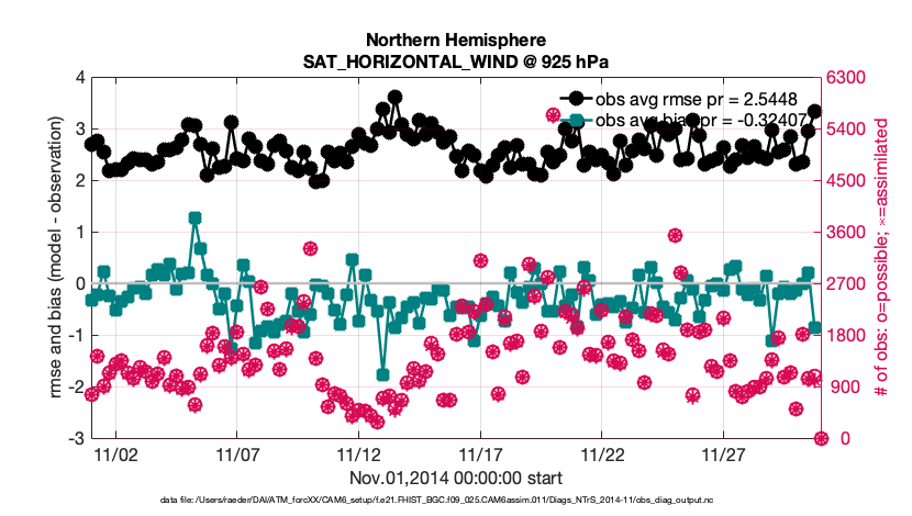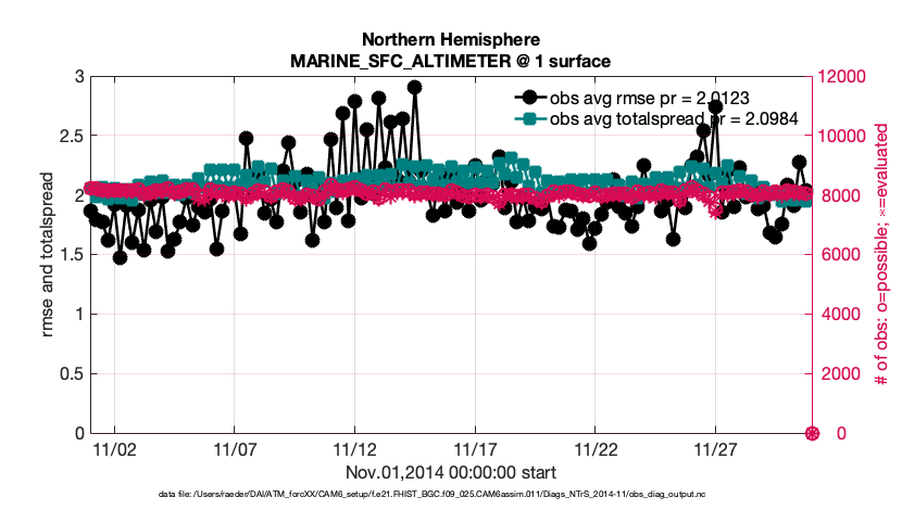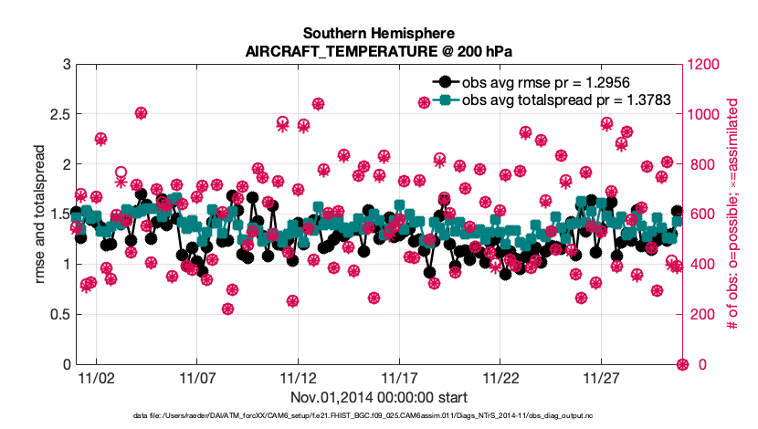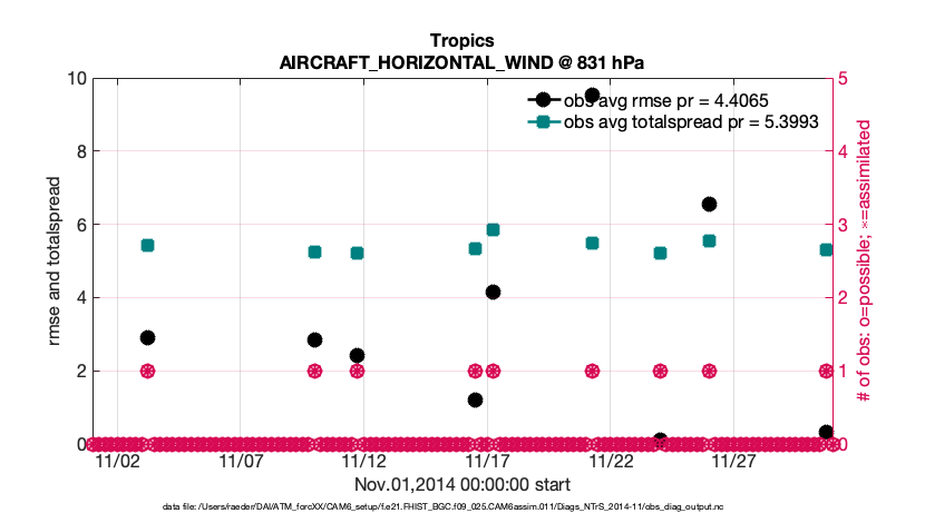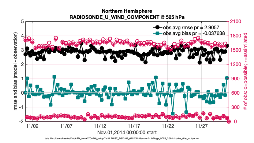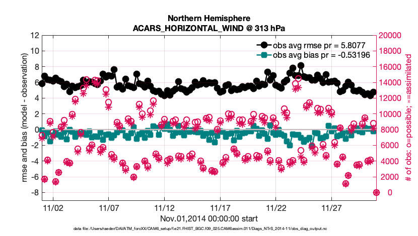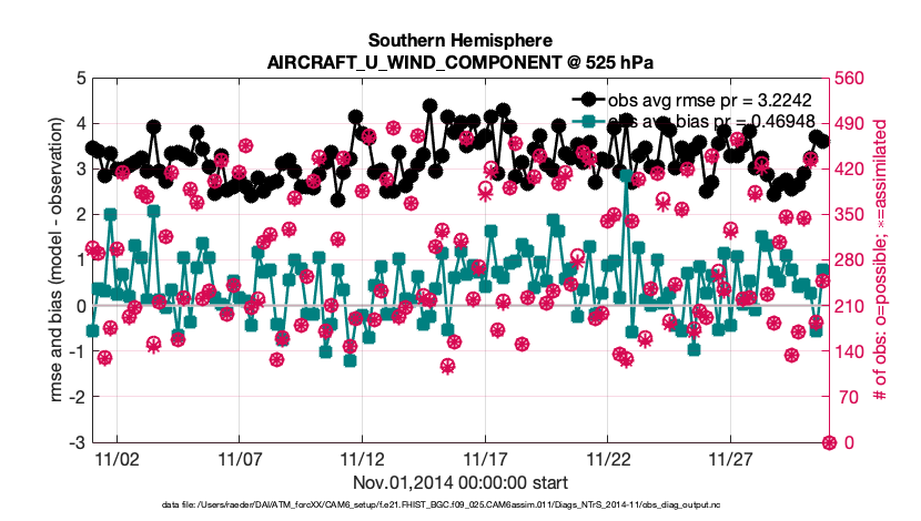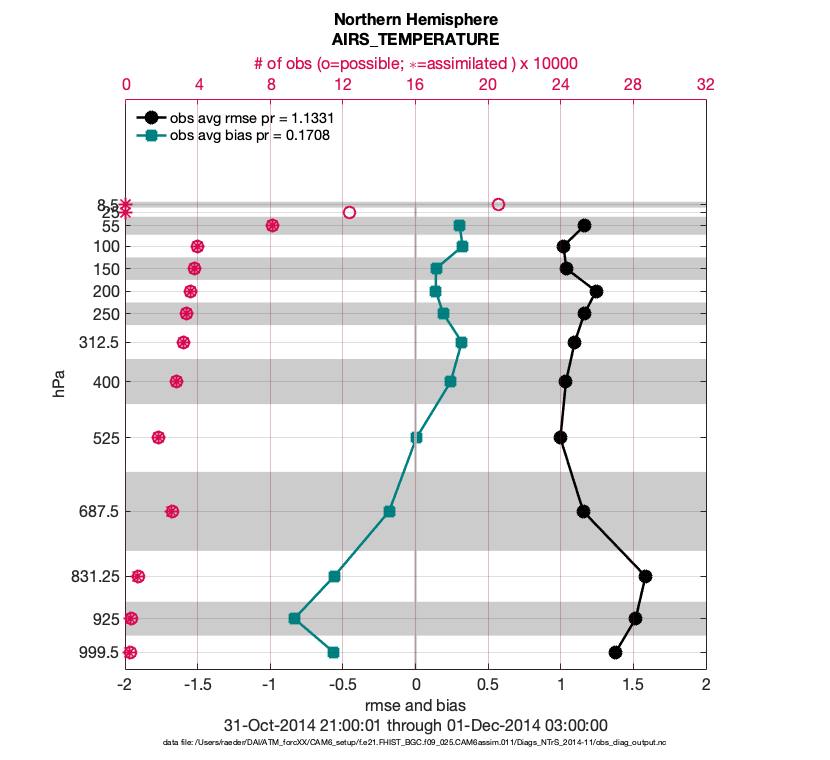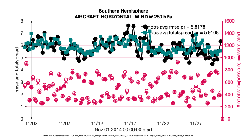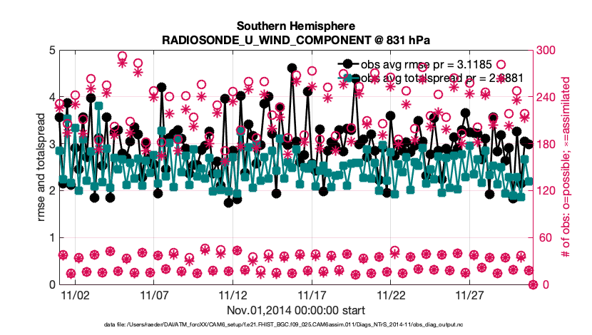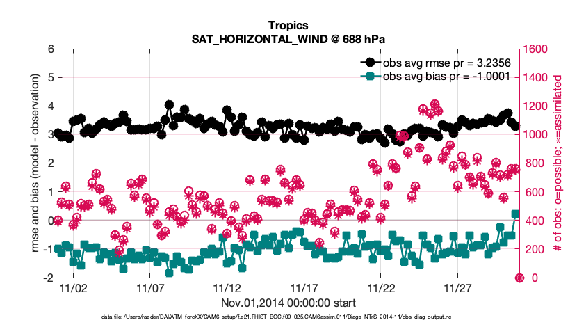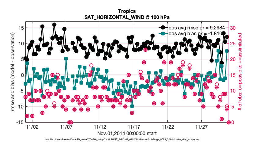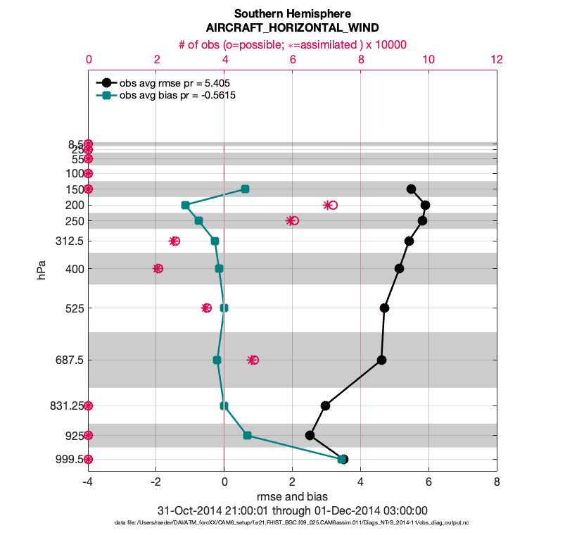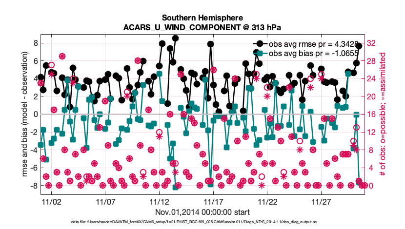 For each observation kind, the root-mean-squared-error (RMSE) is plotted together with: (i) BIAS and (ii) TOTALSPREAD. The number of available, assimilated (evaluated) and rejected observations are also shown on the plots.
