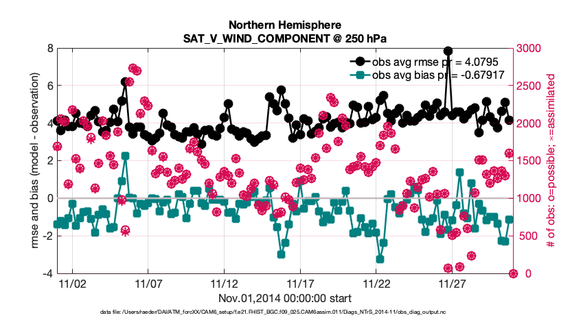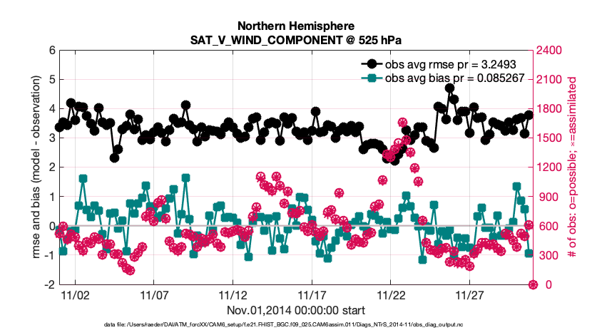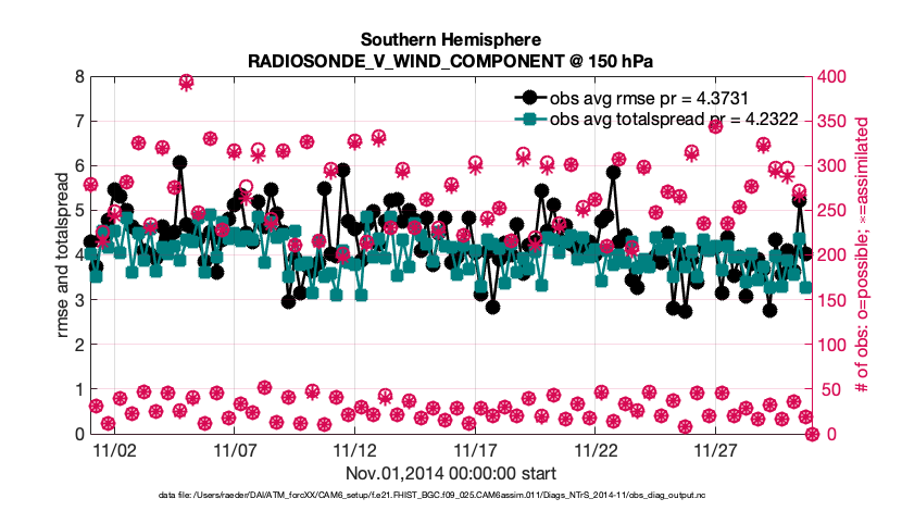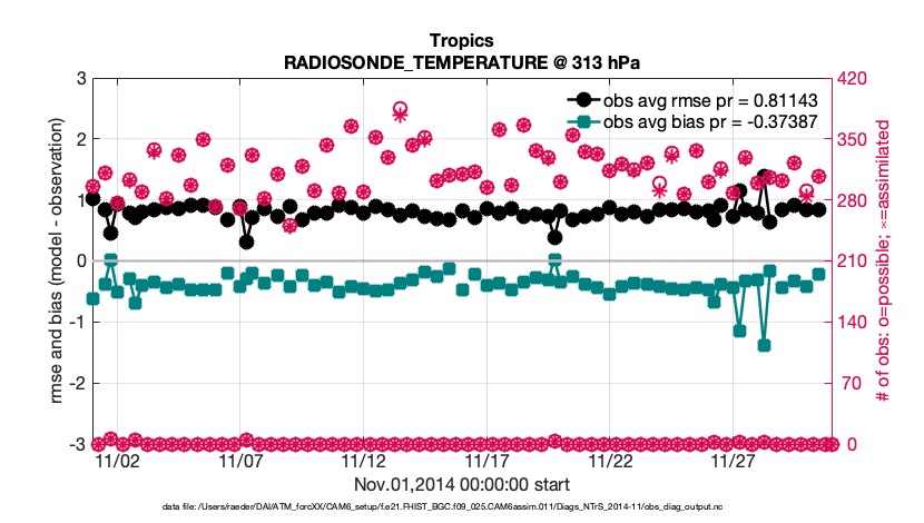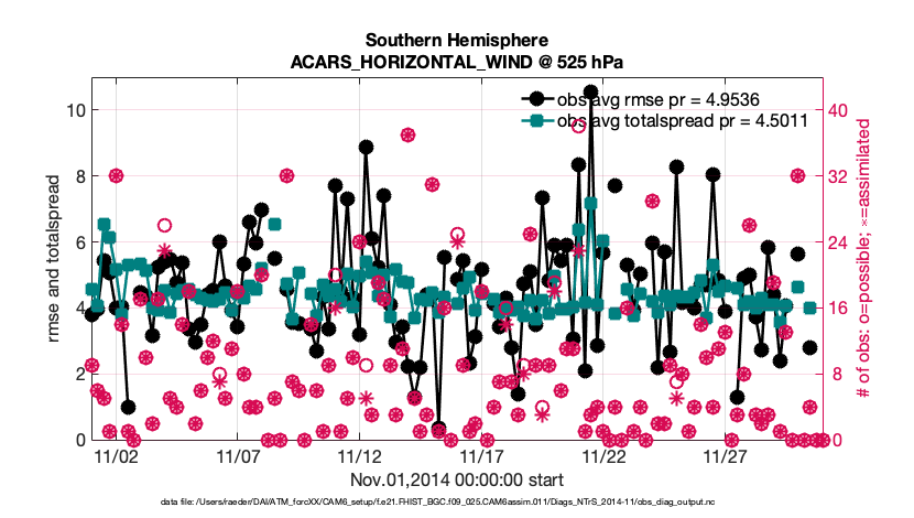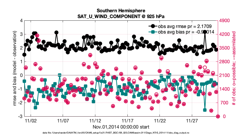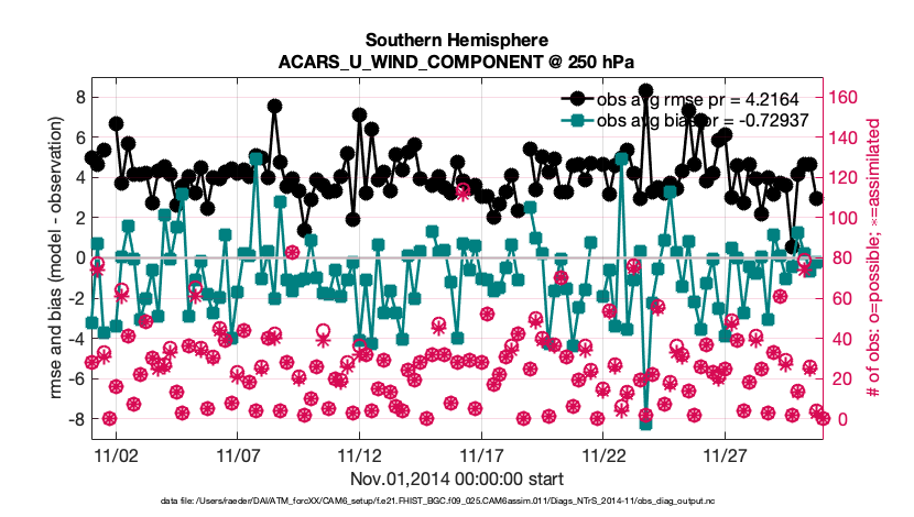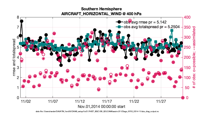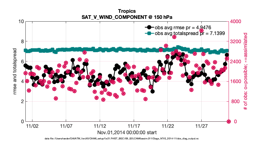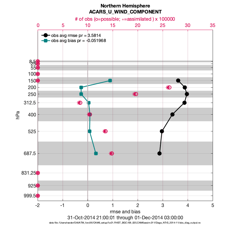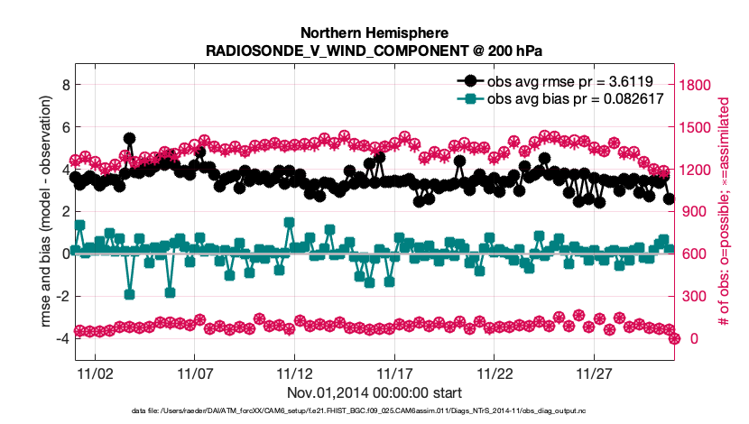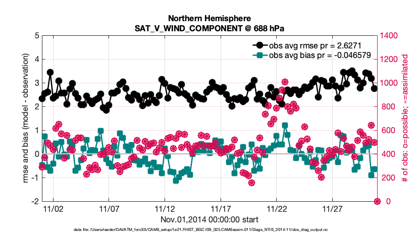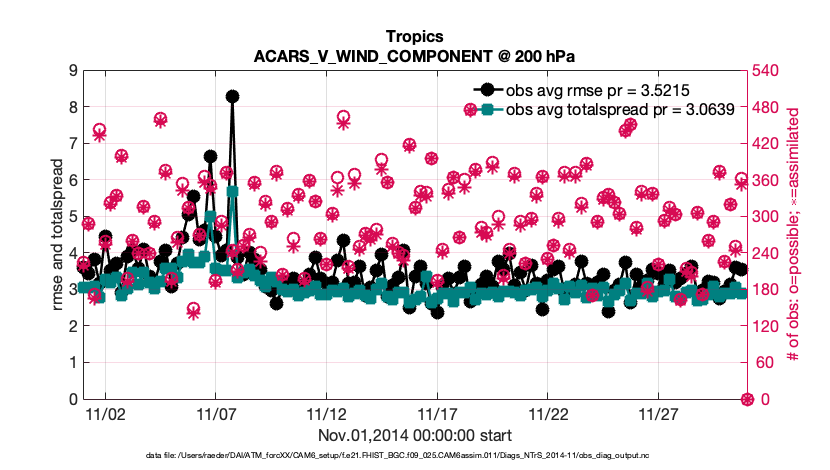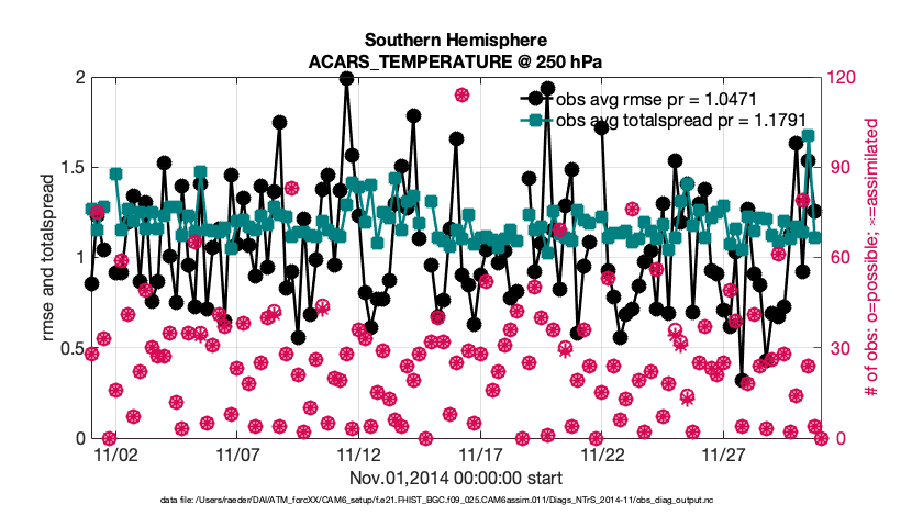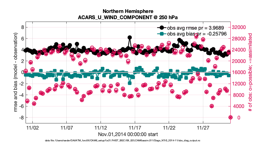 For each observation kind, the root-mean-squared-error (RMSE) is plotted together with: (i) BIAS and (ii) TOTALSPREAD. The number of available, assimilated (evaluated) and rejected observations are also shown on the plots.