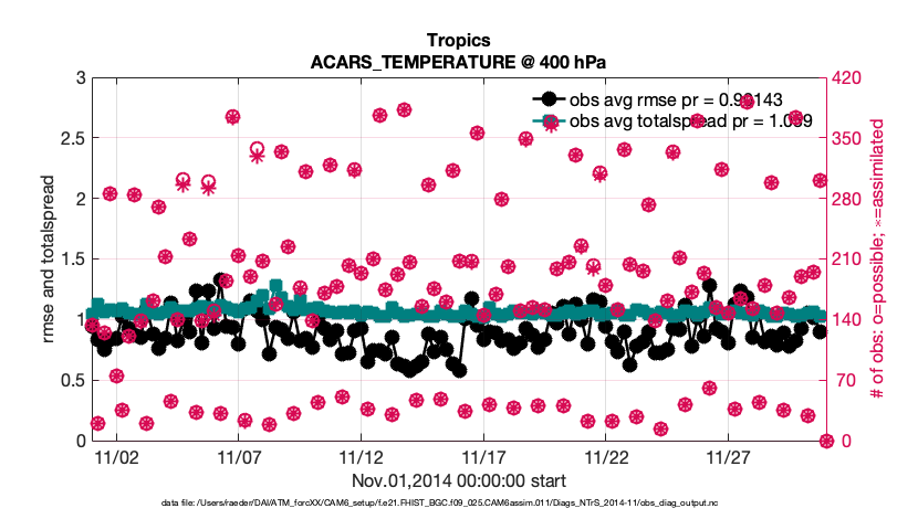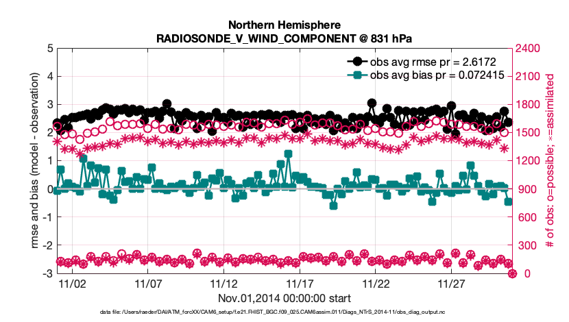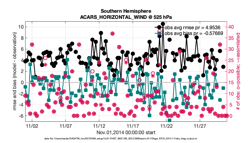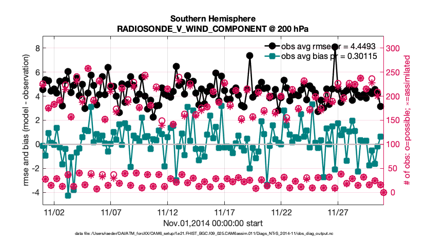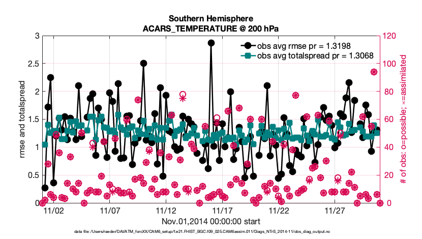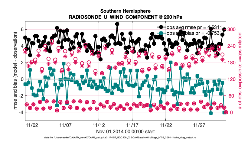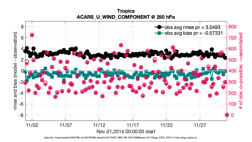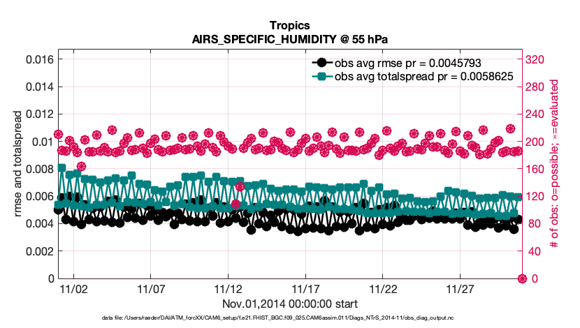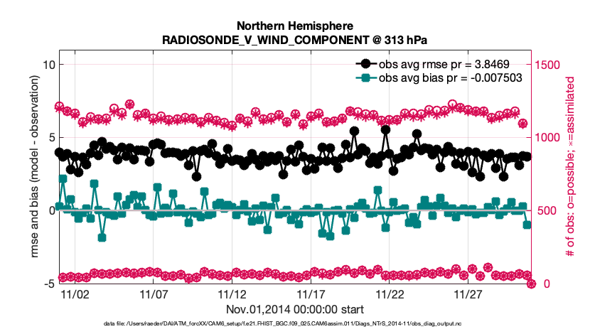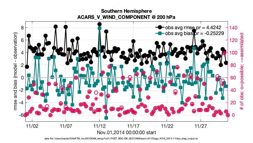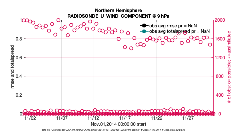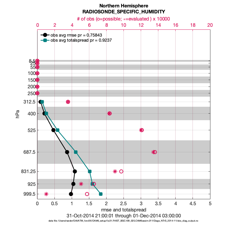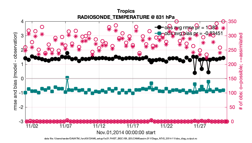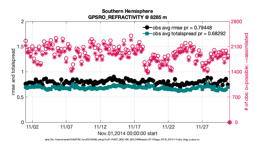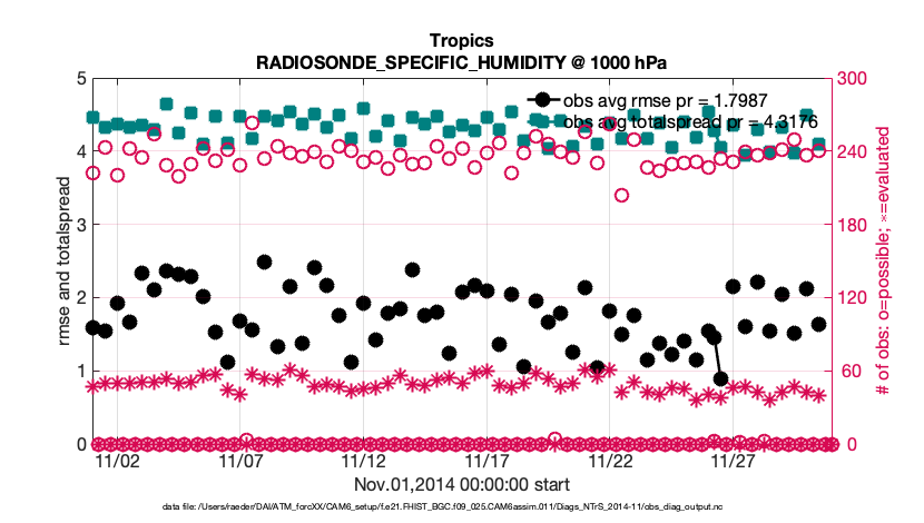 For each observation kind, the root-mean-squared-error (RMSE) is plotted together with: (i) BIAS and (ii) TOTALSPREAD. The number of available, assimilated (evaluated) and rejected observations are also shown on the plots.