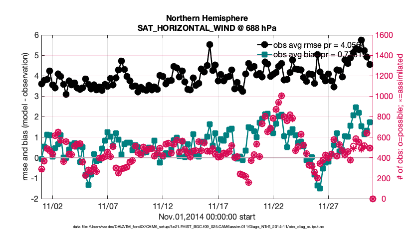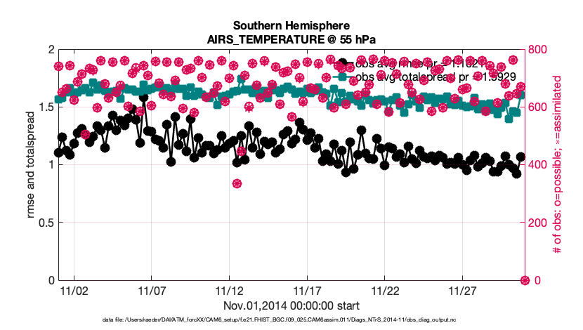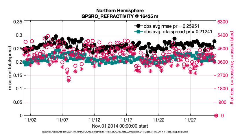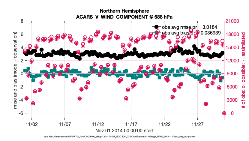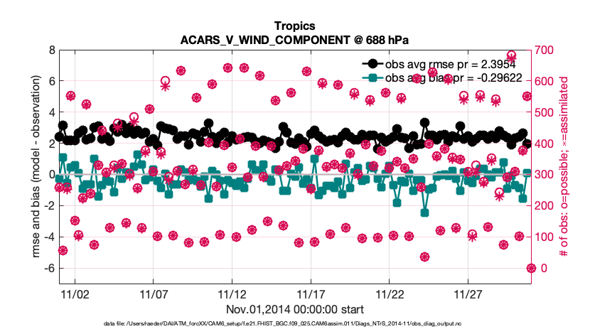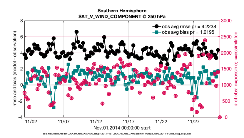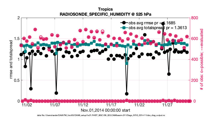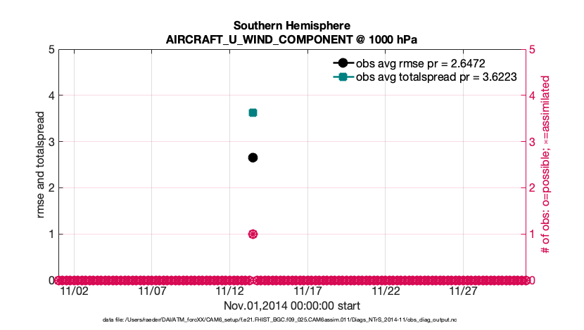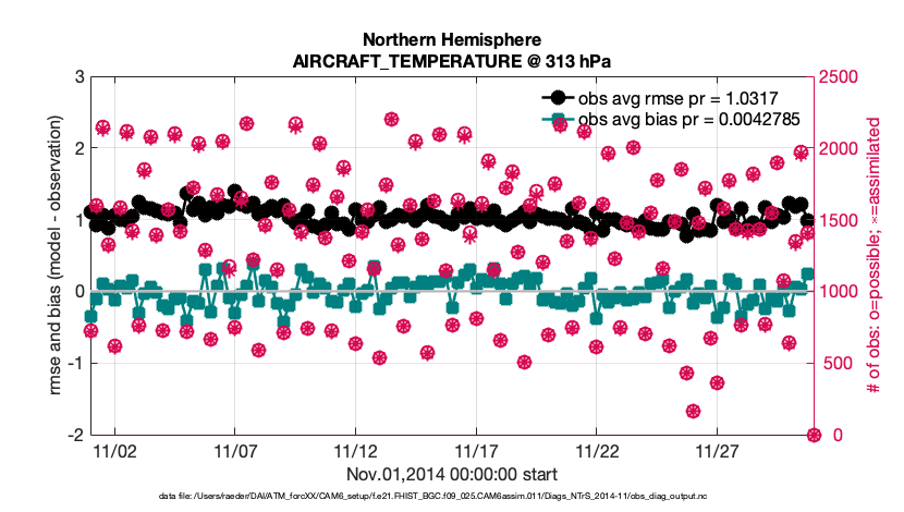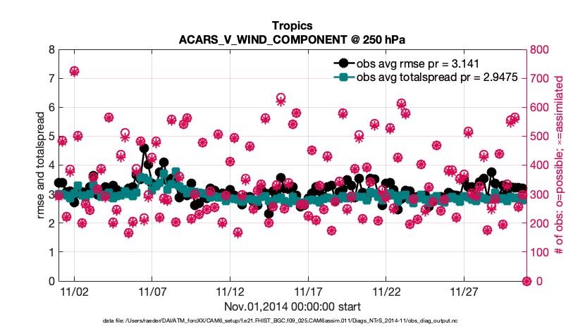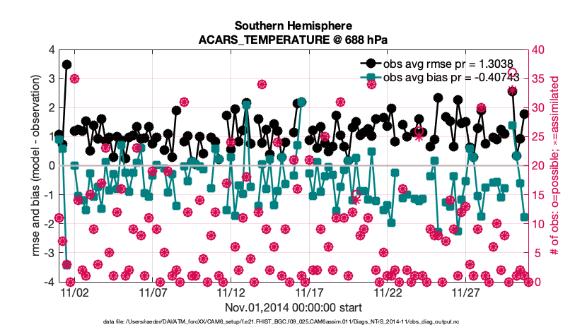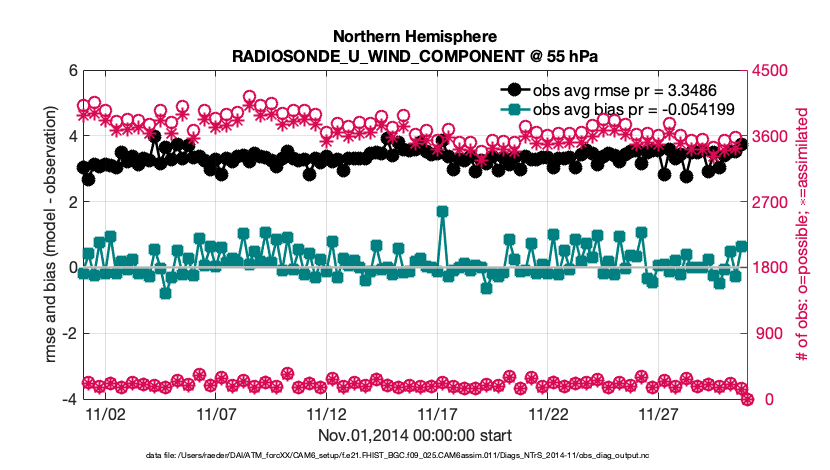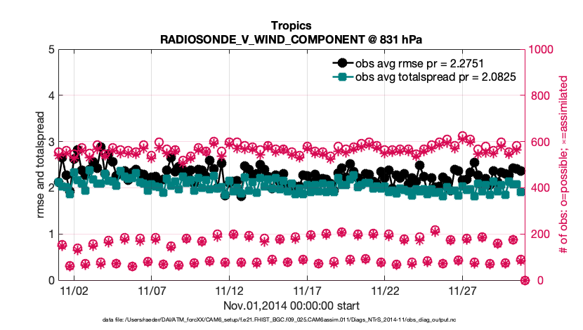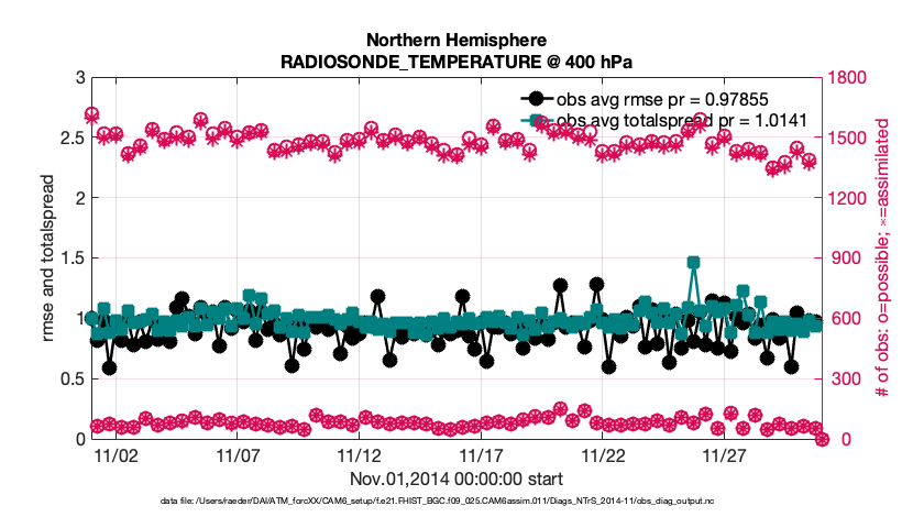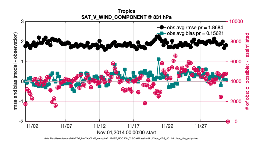For each observation kind, the root-mean-squared-error (RMSE) is plotted together with: (i) BIAS and (ii) TOTALSPREAD. The number of available, assimilated (evaluated) and rejected observations are also shown on the plots.