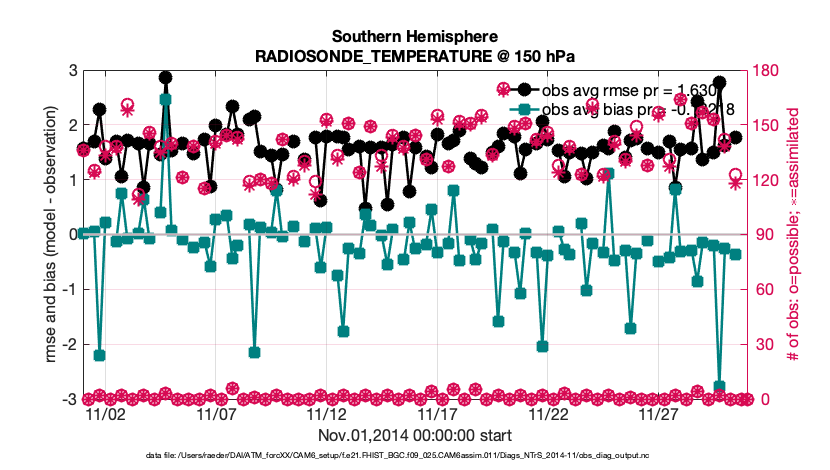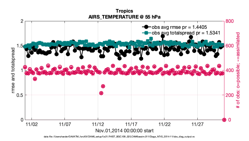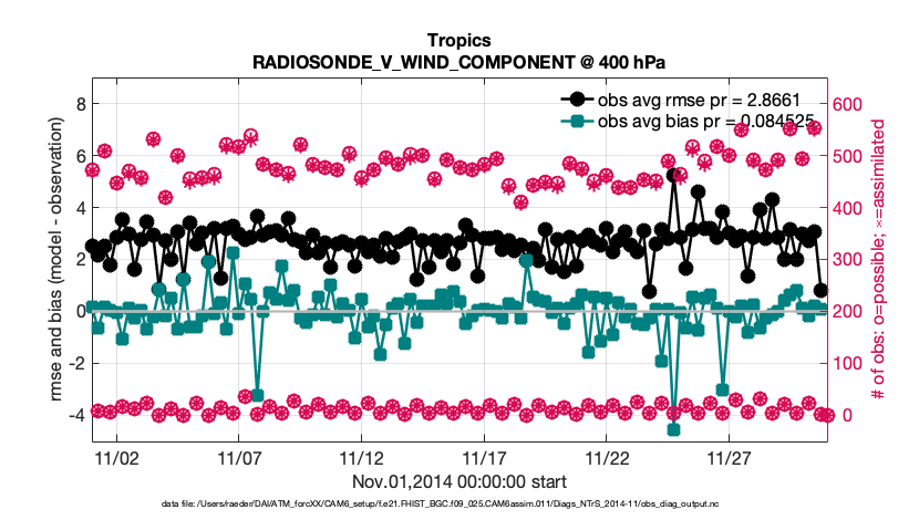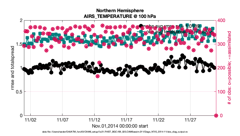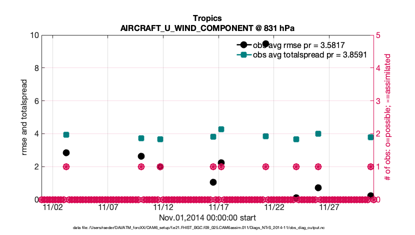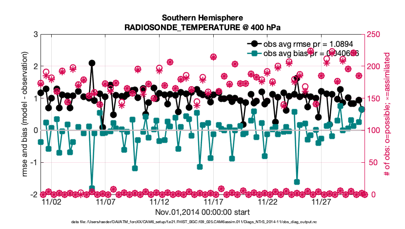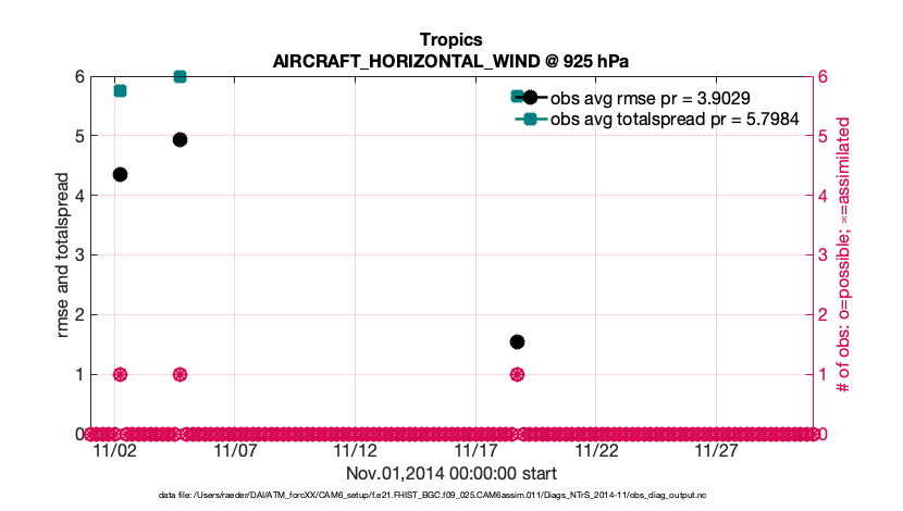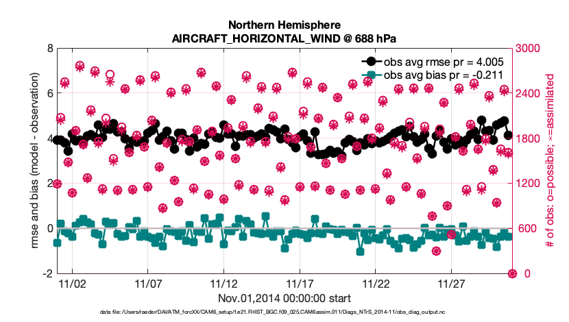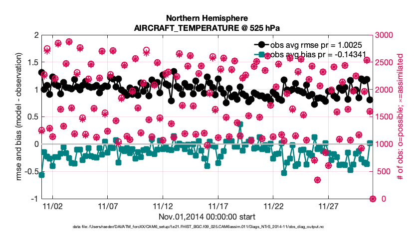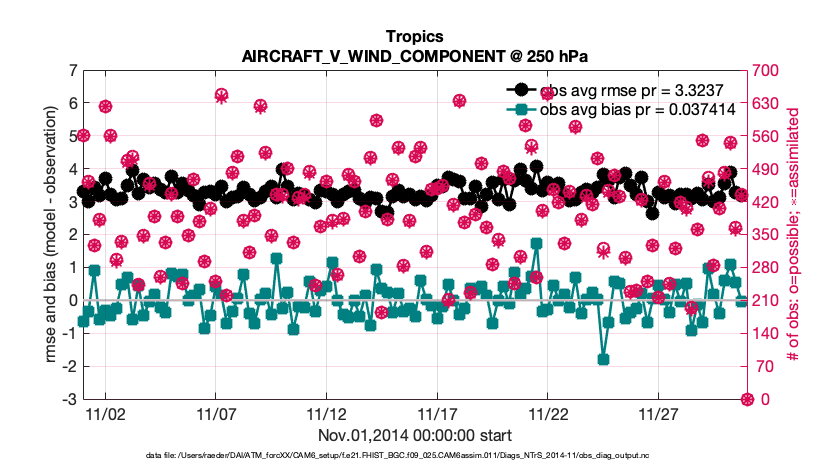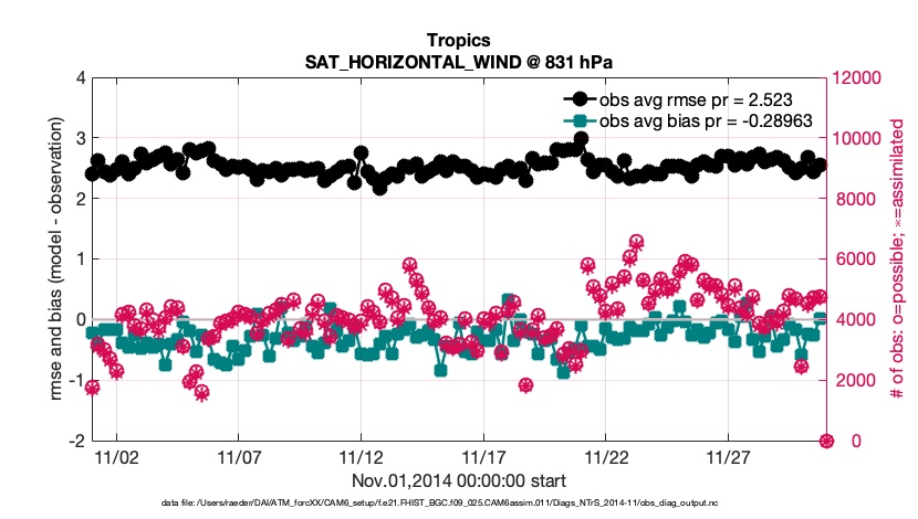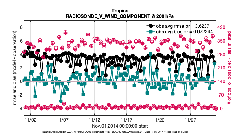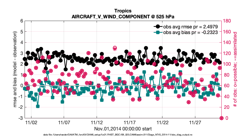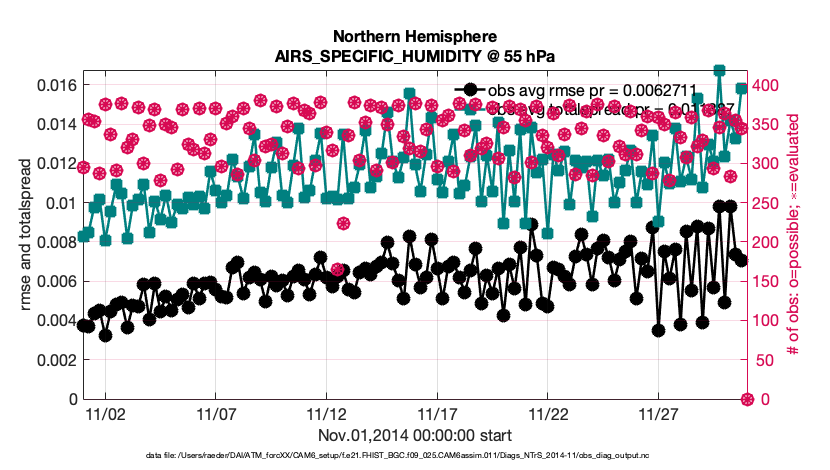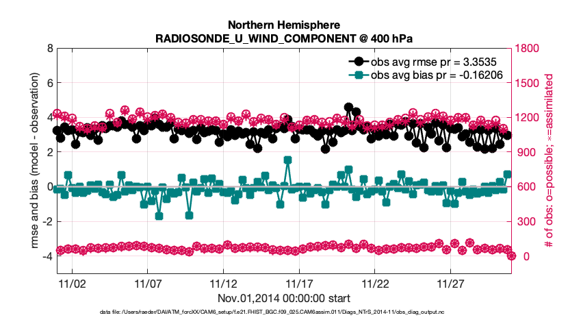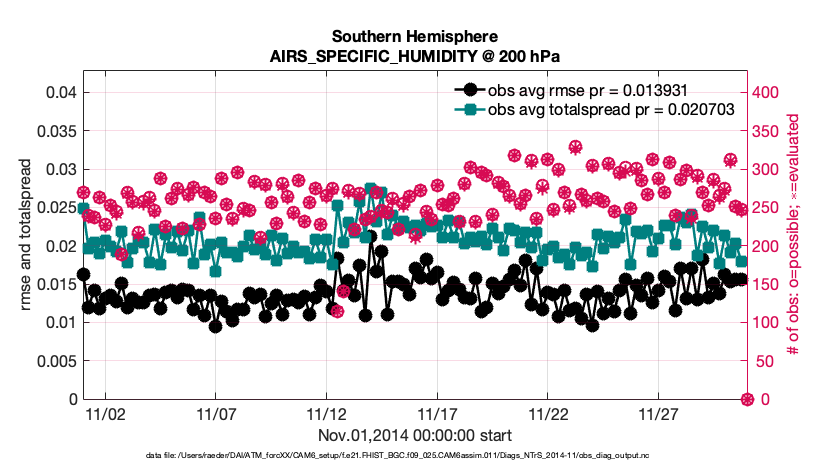 For each observation kind, the root-mean-squared-error (RMSE) is plotted together with: (i) BIAS and (ii) TOTALSPREAD. The number of available, assimilated (evaluated) and rejected observations are also shown on the plots.