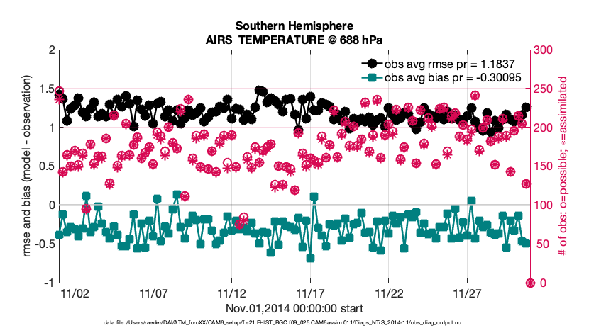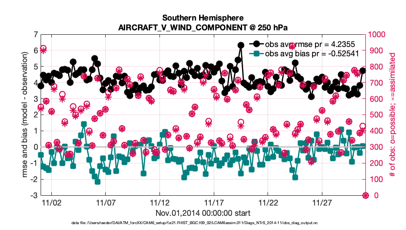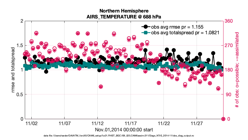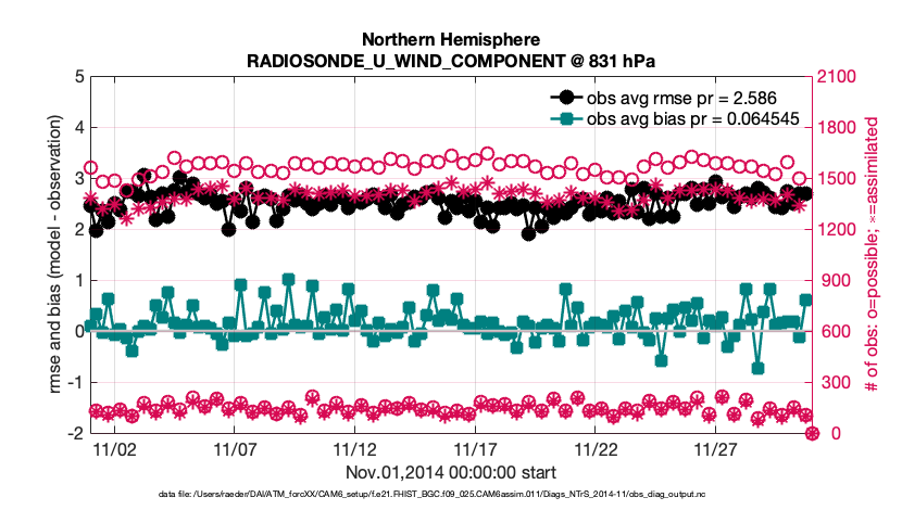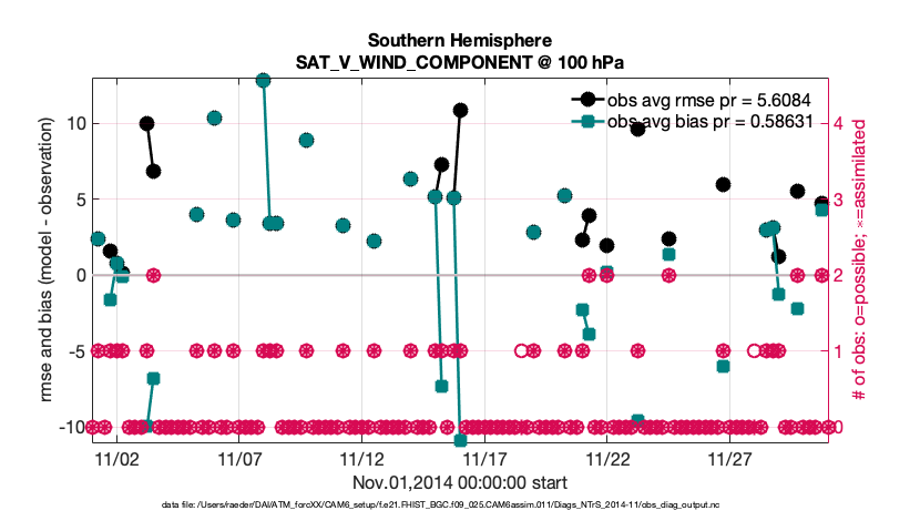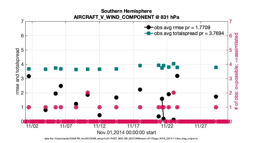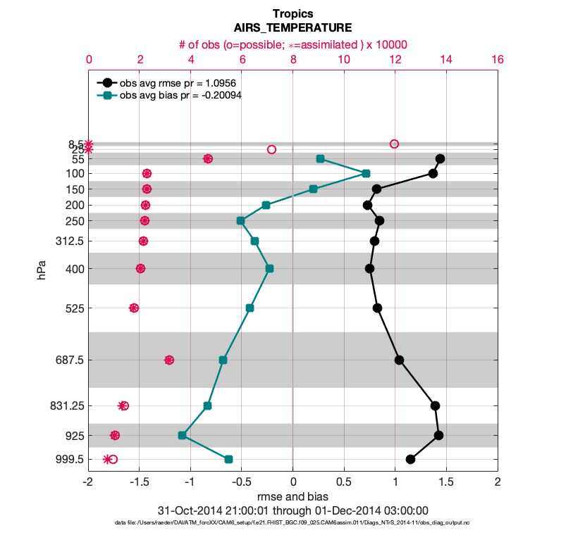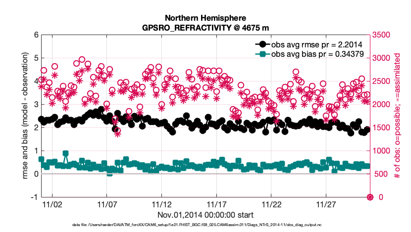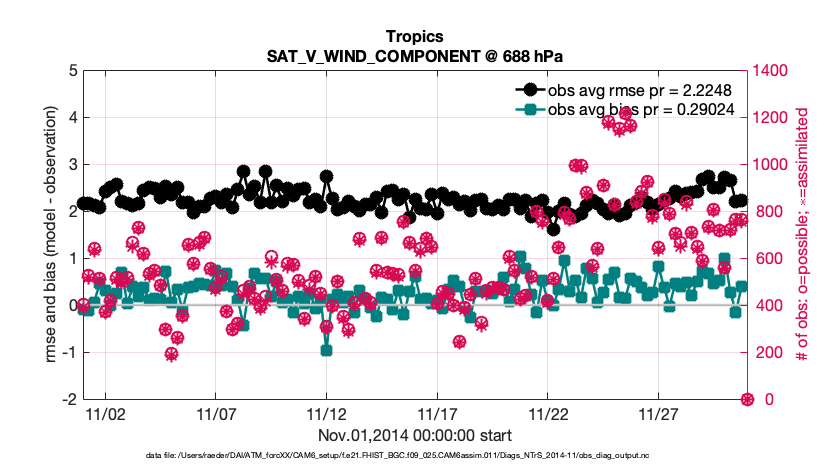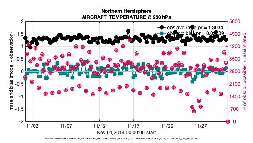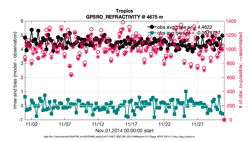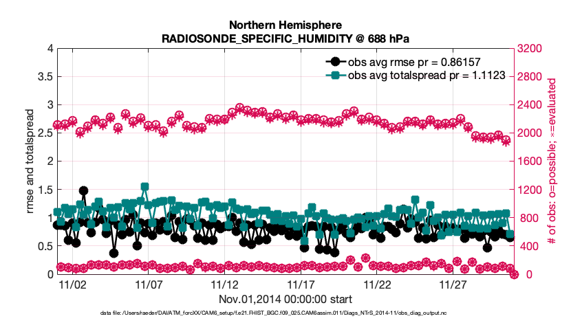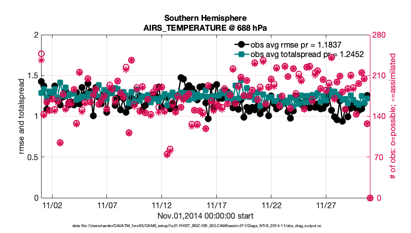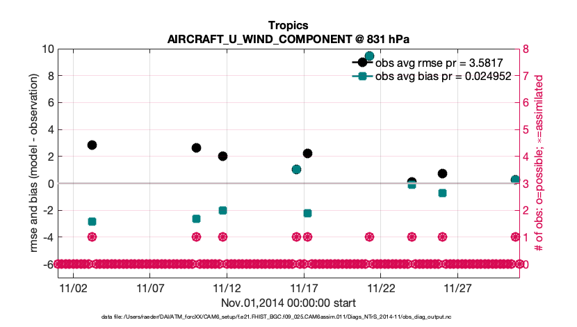 For each observation kind, the root-mean-squared-error (RMSE) is plotted together with: (i) BIAS and (ii) TOTALSPREAD. The number of available, assimilated (evaluated) and rejected observations are also shown on the plots.