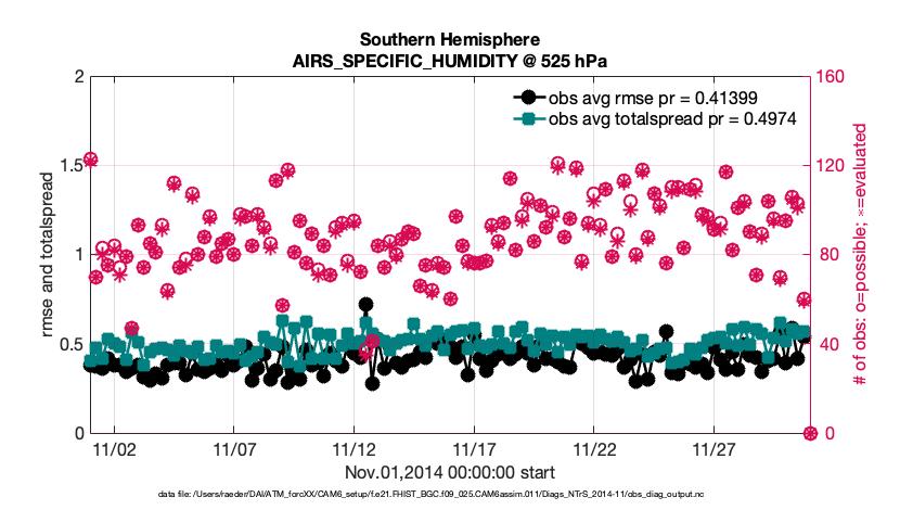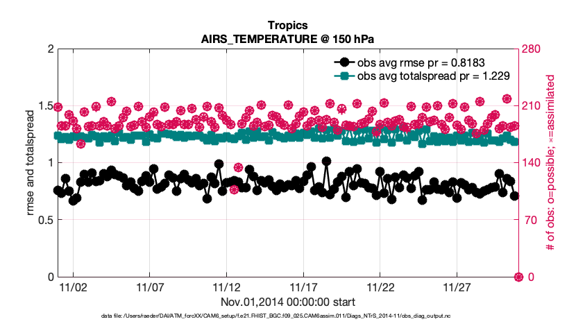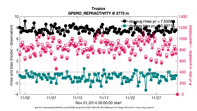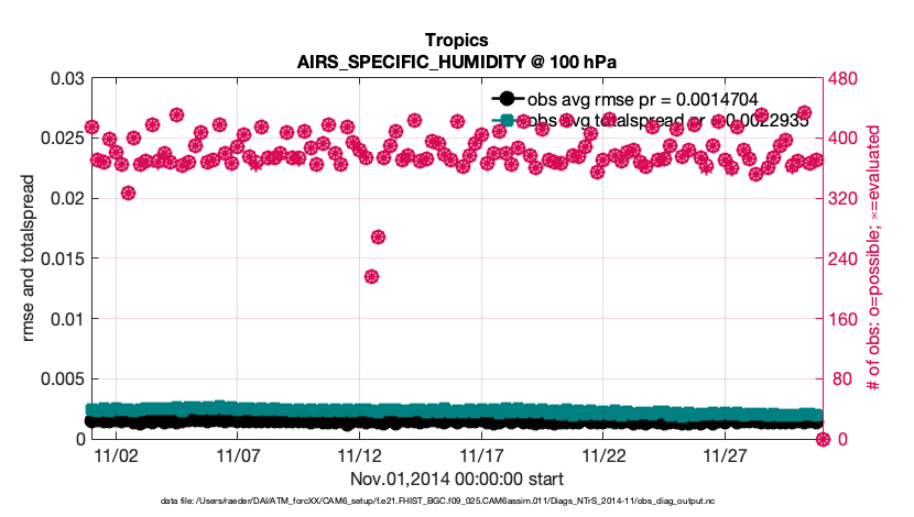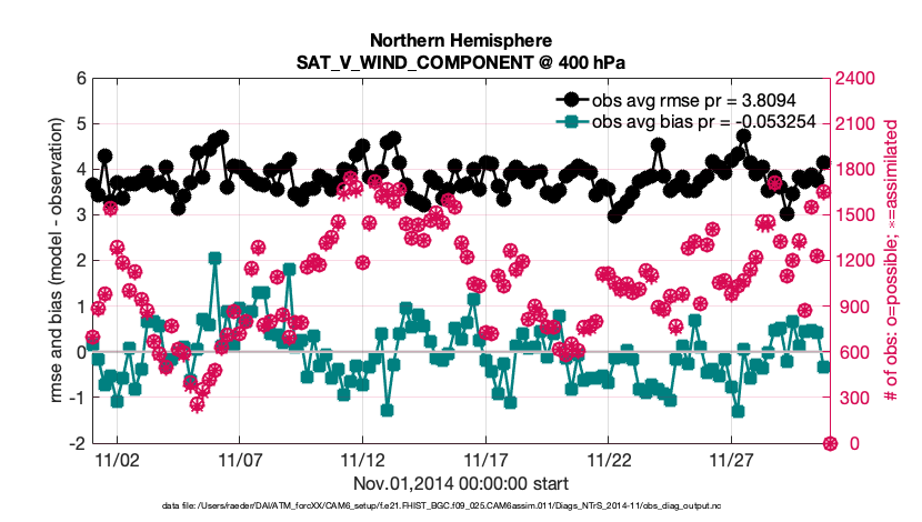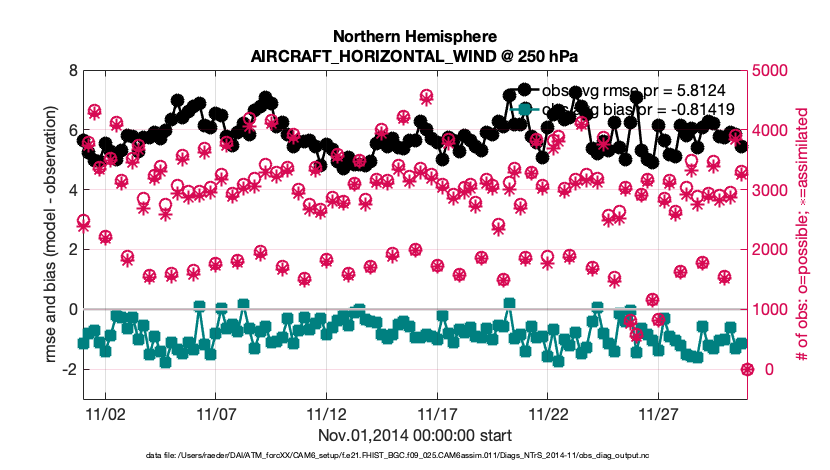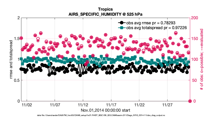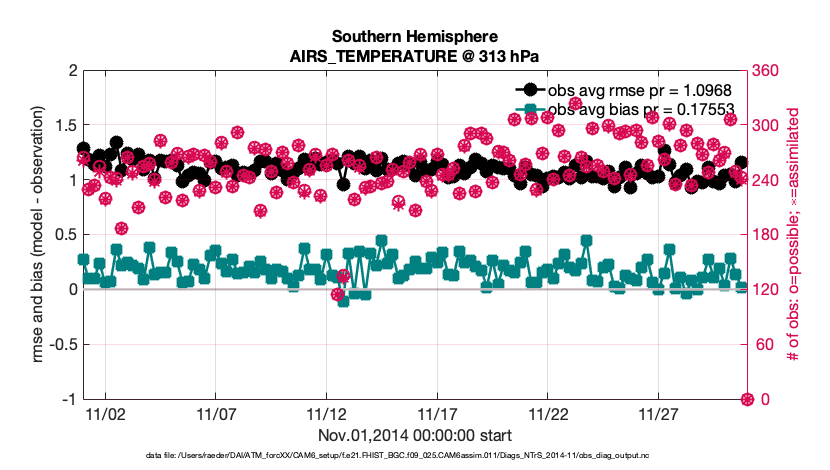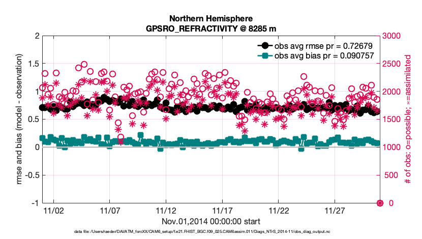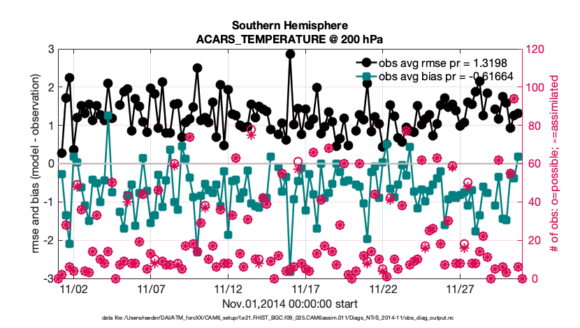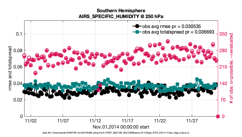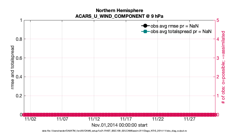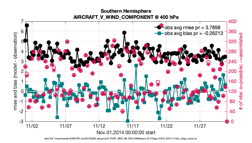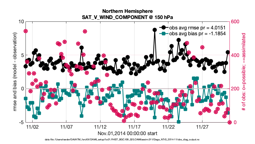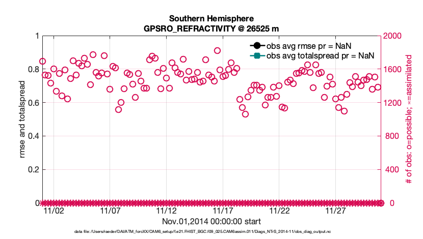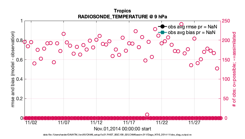 For each observation kind, the root-mean-squared-error (RMSE) is plotted together with: (i) BIAS and (ii) TOTALSPREAD. The number of available, assimilated (evaluated) and rejected observations are also shown on the plots.
