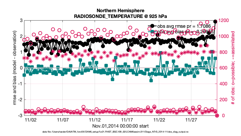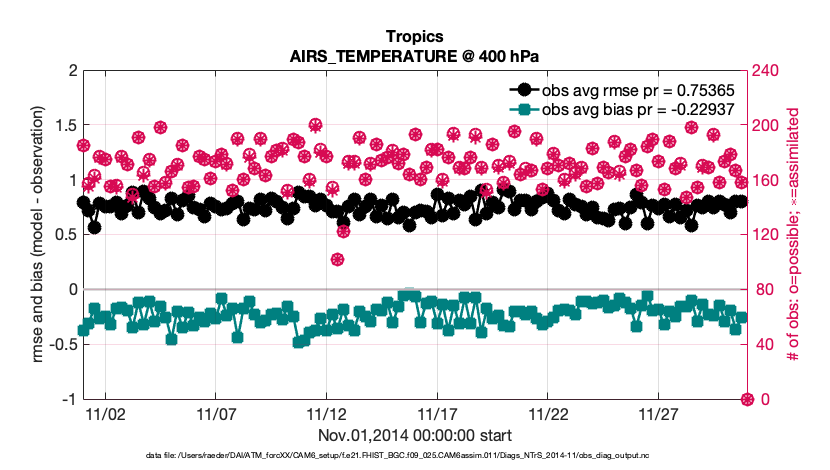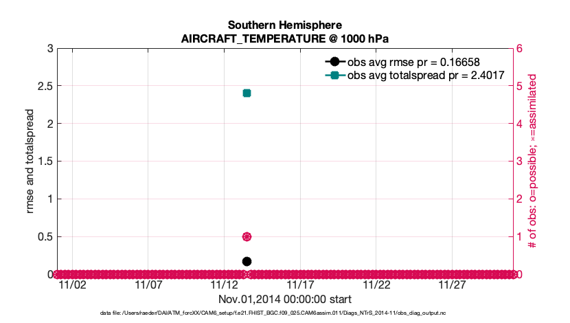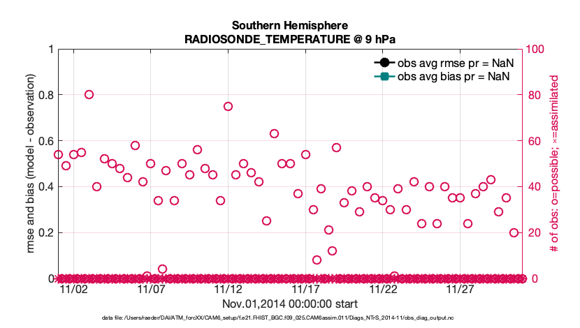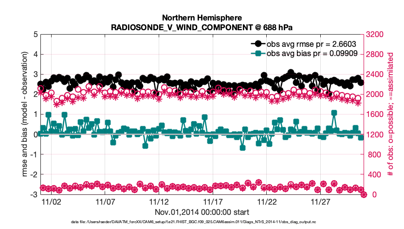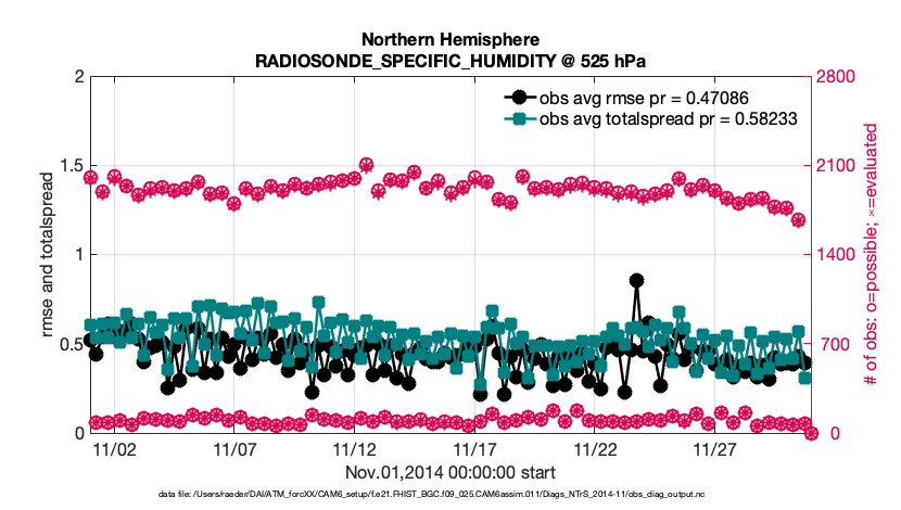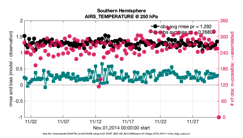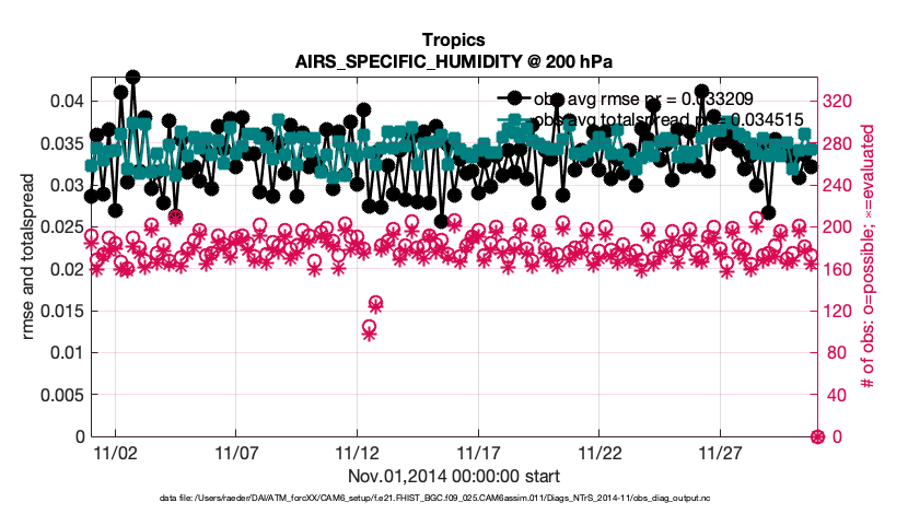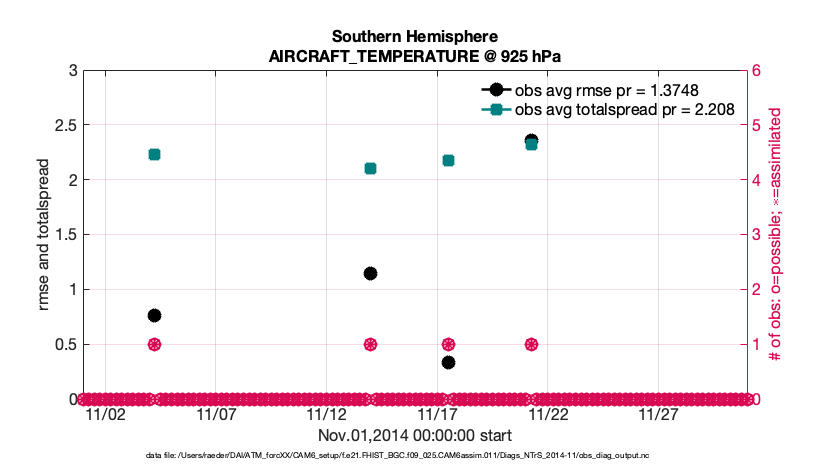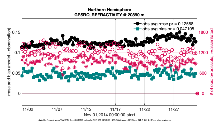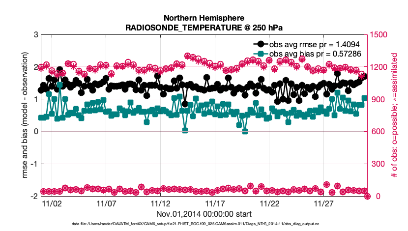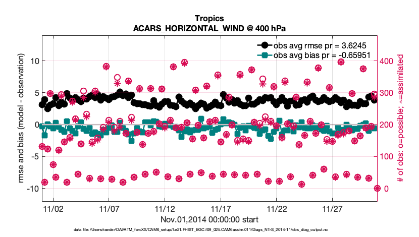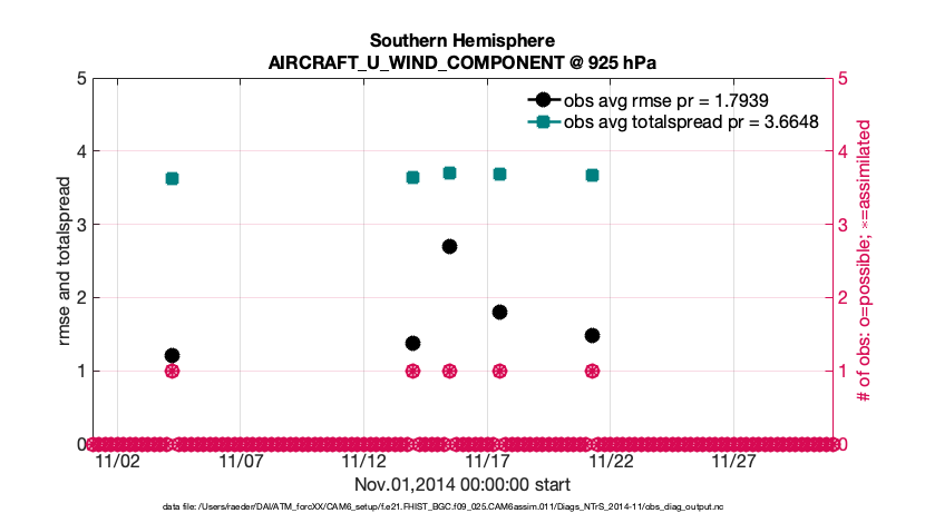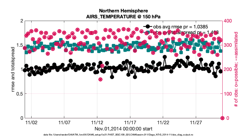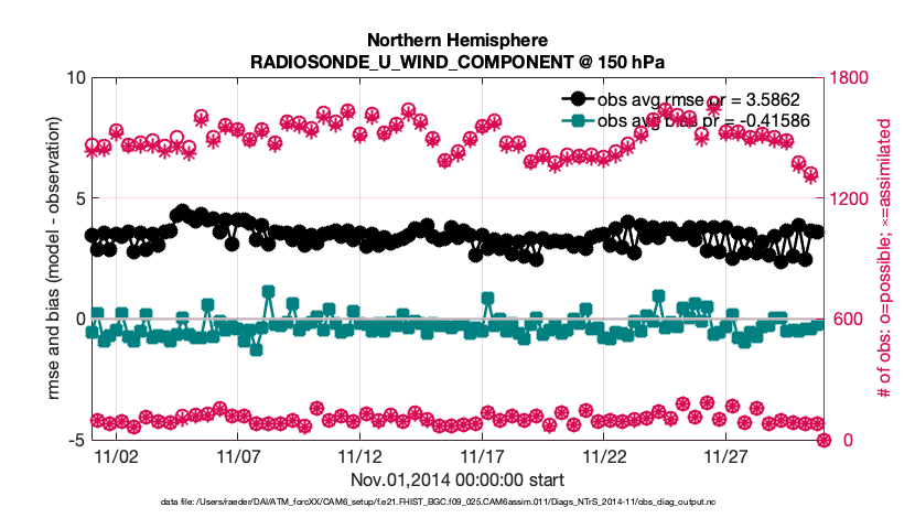 For each observation kind, the root-mean-squared-error (RMSE) is plotted together with: (i) BIAS and (ii) TOTALSPREAD. The number of available, assimilated (evaluated) and rejected observations are also shown on the plots.
