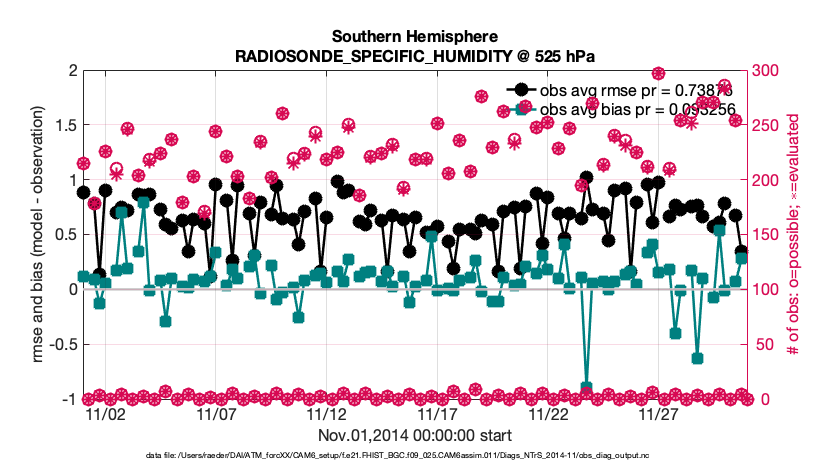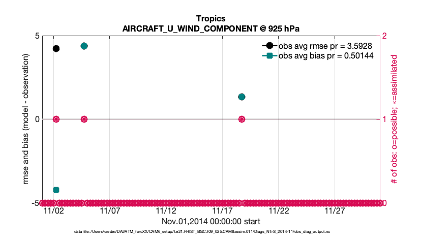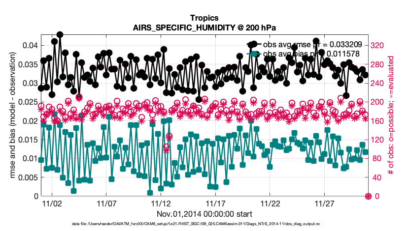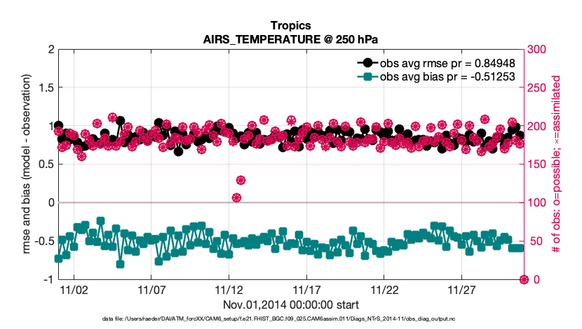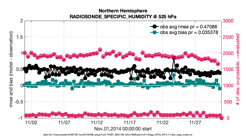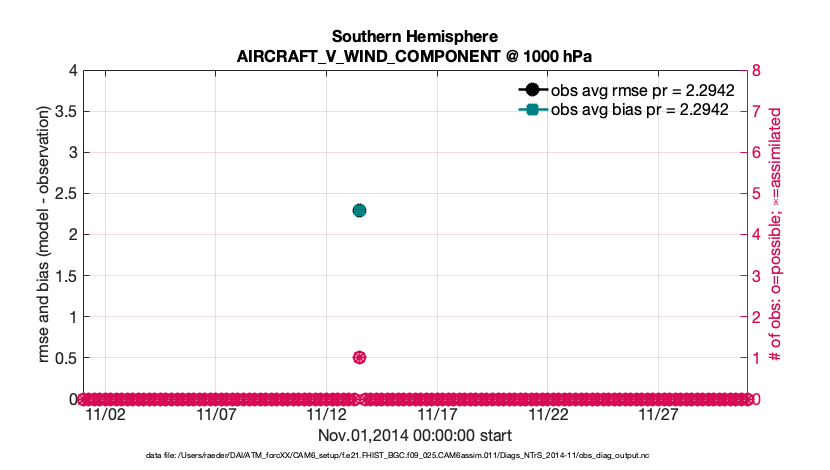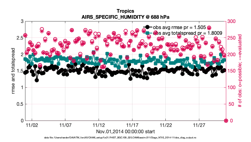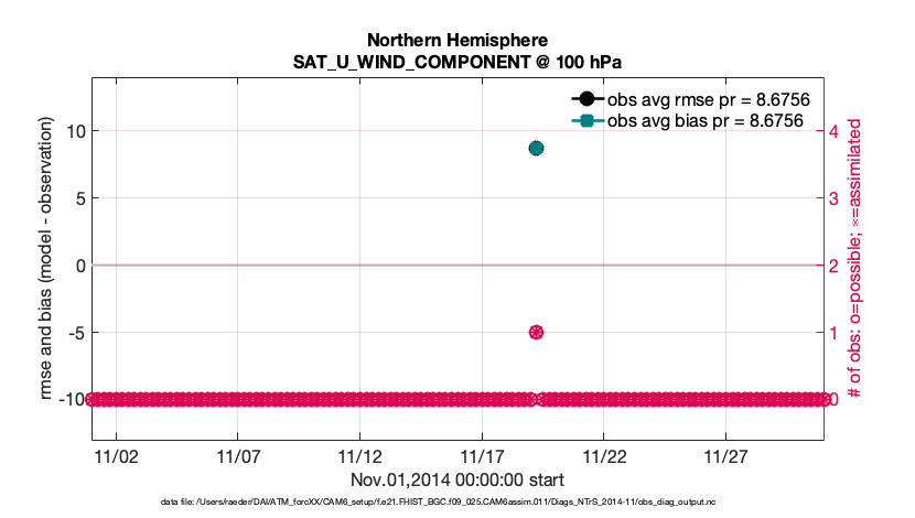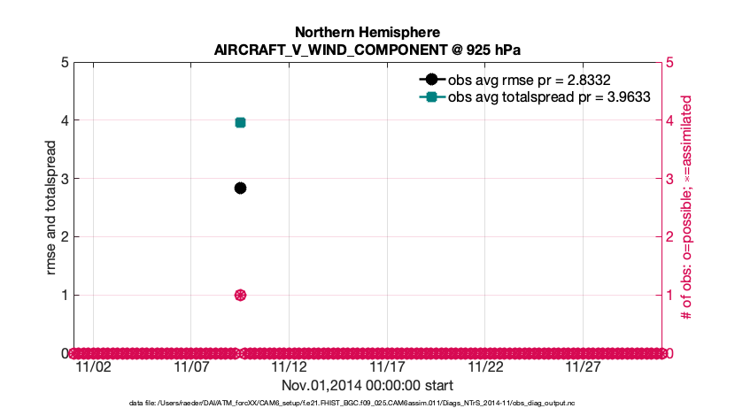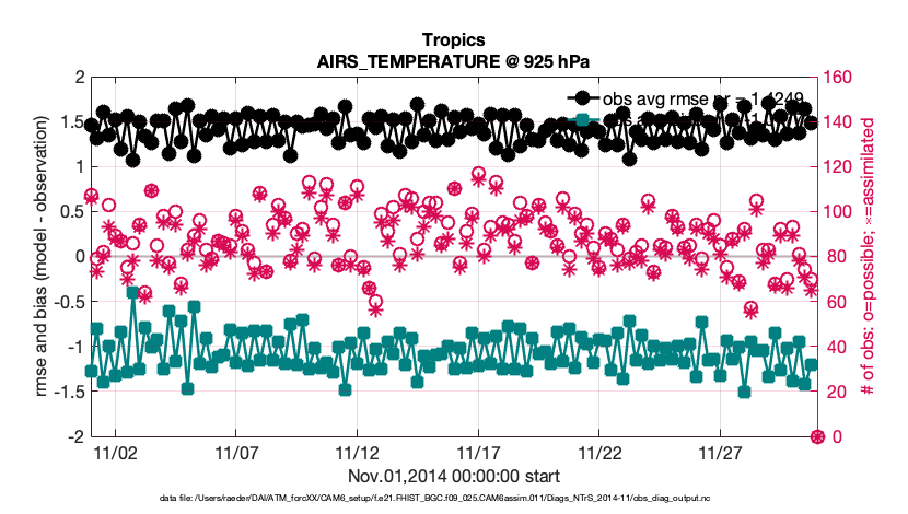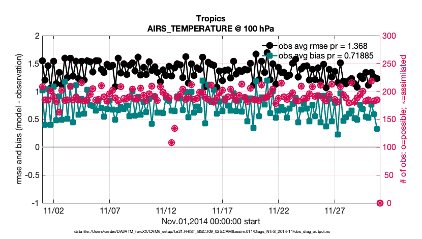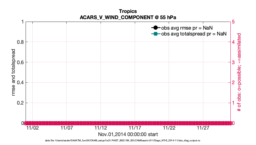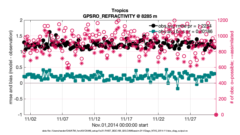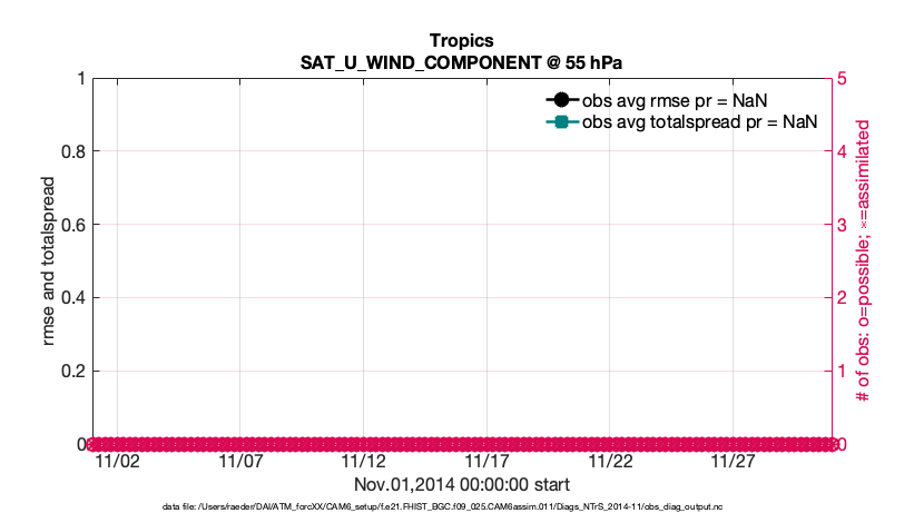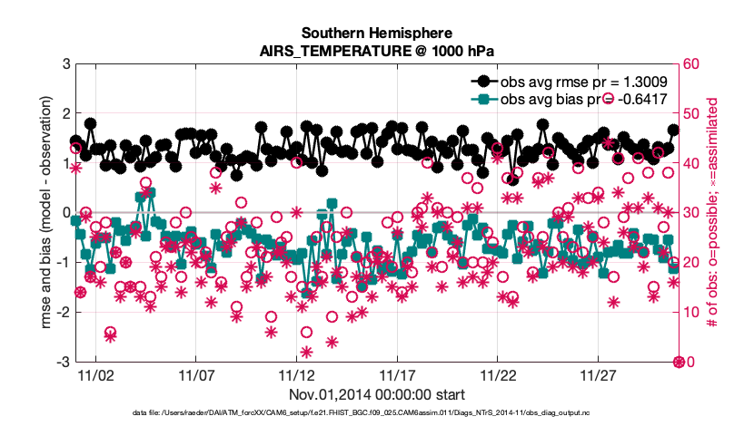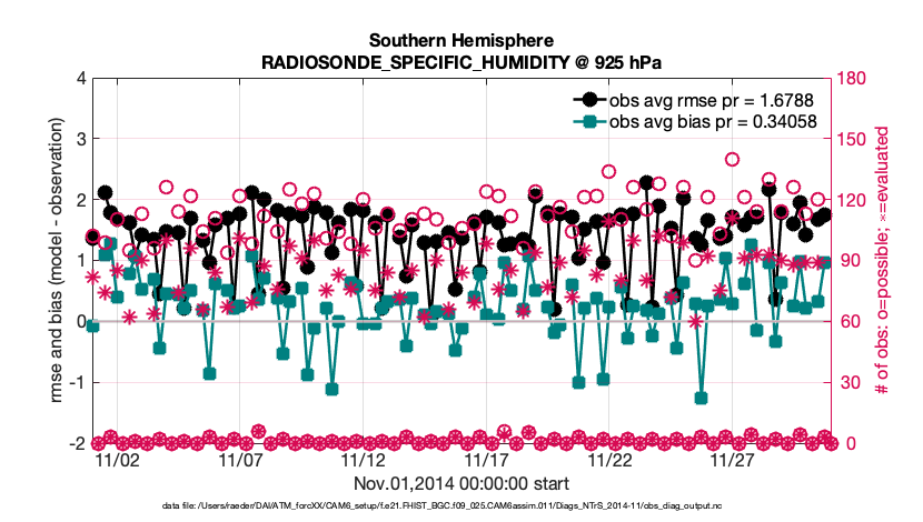 For each observation kind, the root-mean-squared-error (RMSE) is plotted together with: (i) BIAS and (ii) TOTALSPREAD. The number of available, assimilated (evaluated) and rejected observations are also shown on the plots.