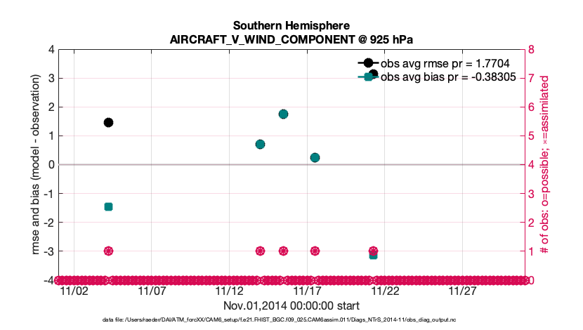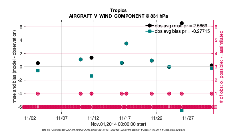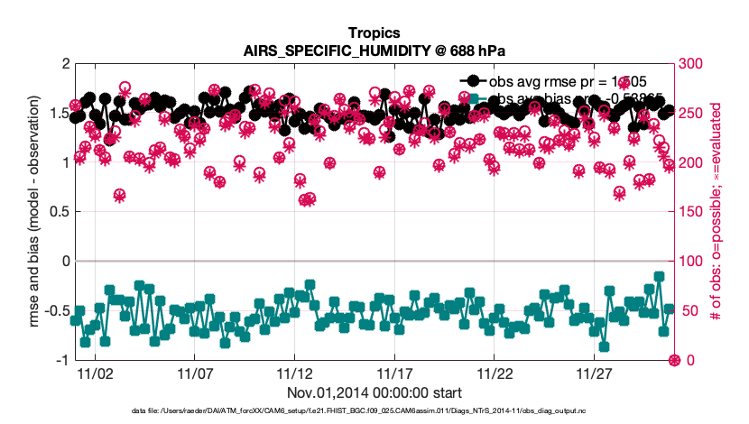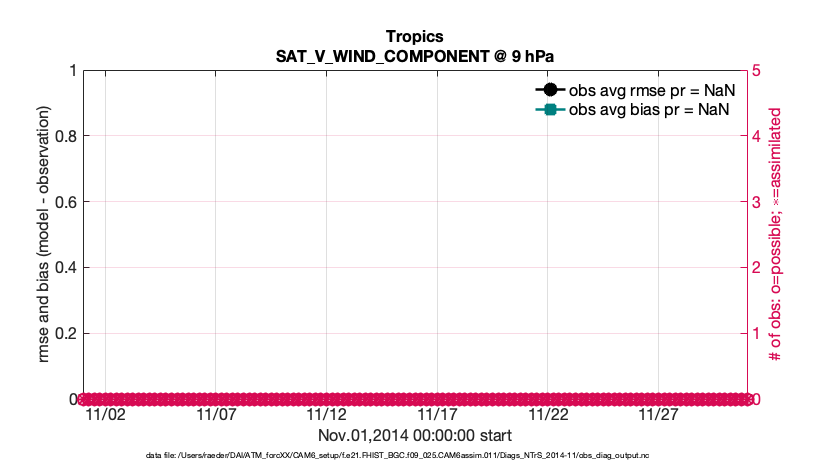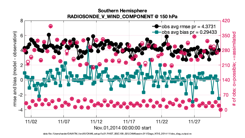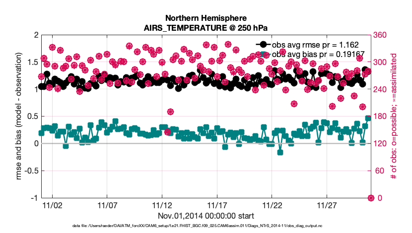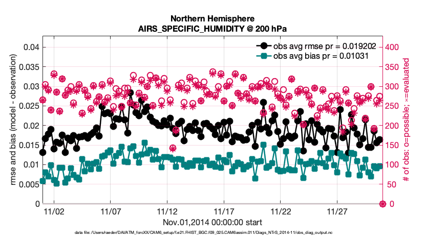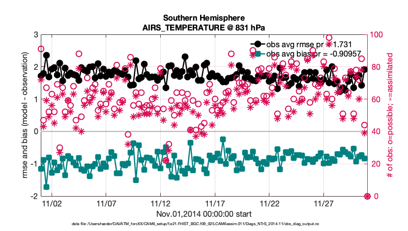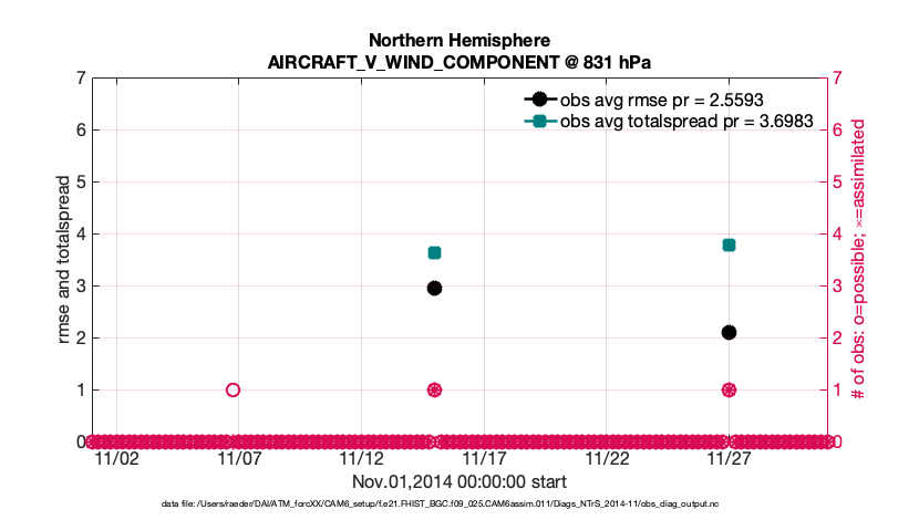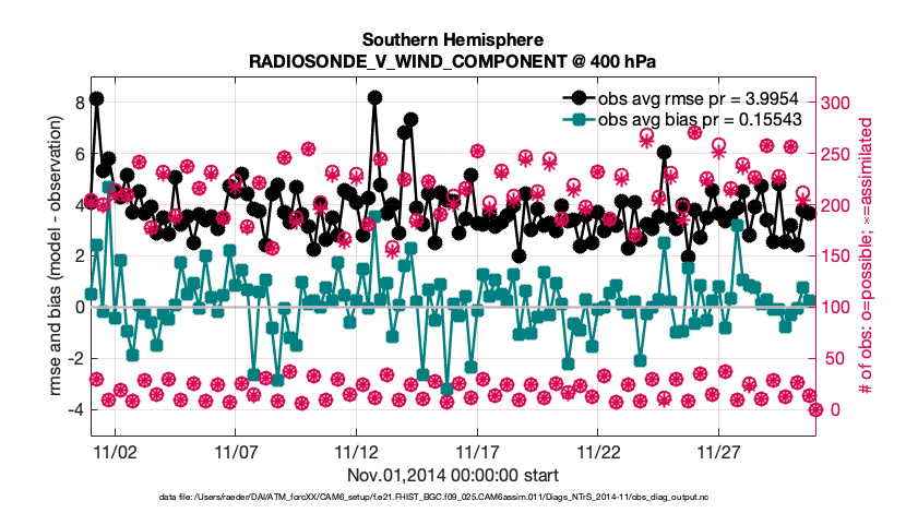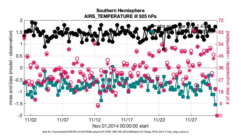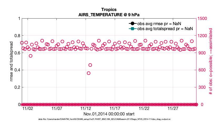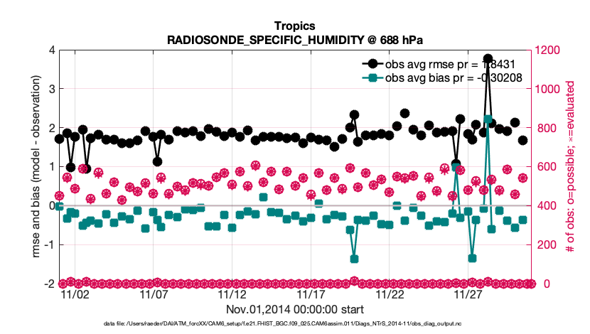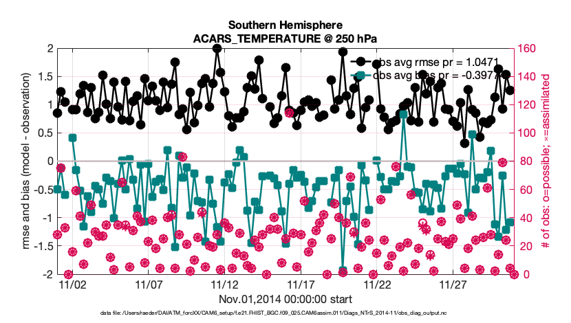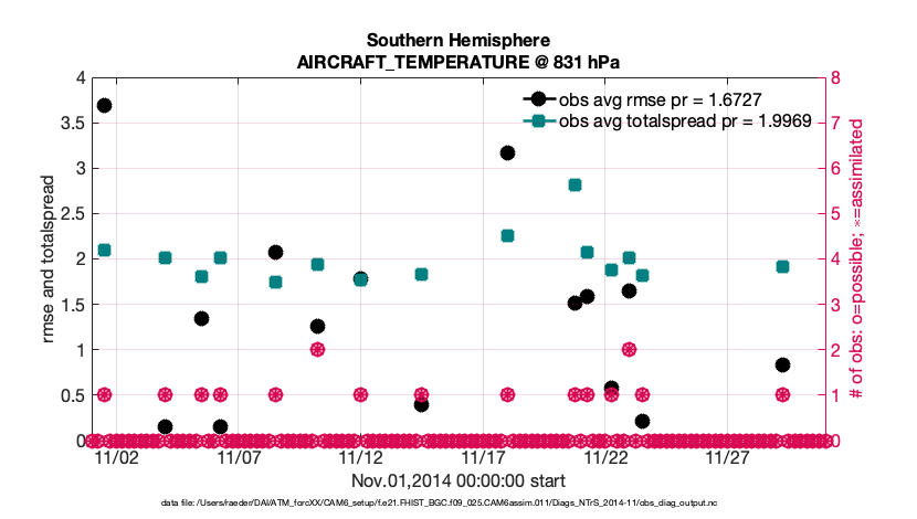 For each observation kind, the root-mean-squared-error (RMSE) is plotted together with: (i) BIAS and (ii) TOTALSPREAD. The number of available, assimilated (evaluated) and rejected observations are also shown on the plots.