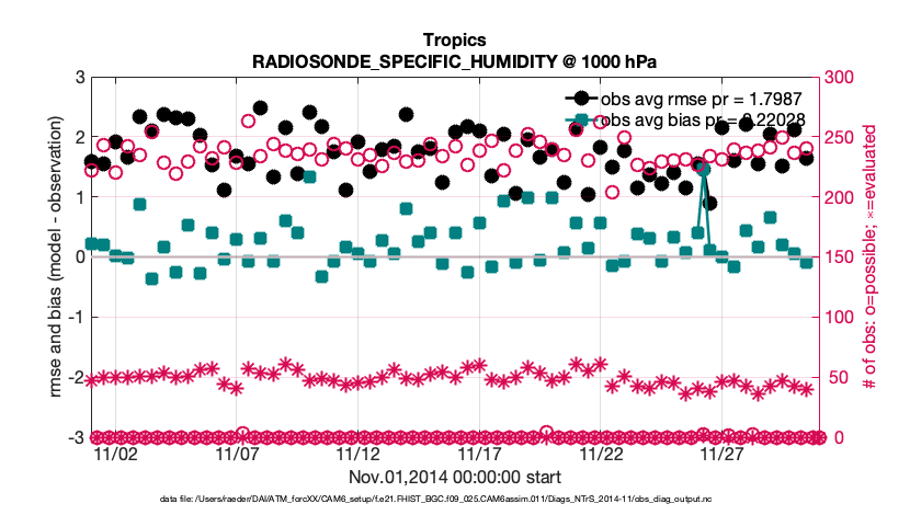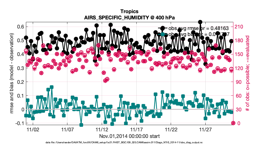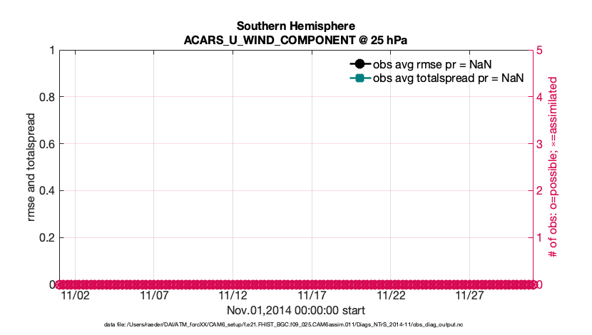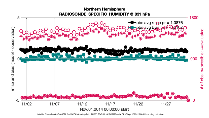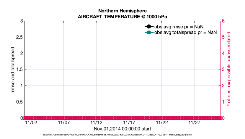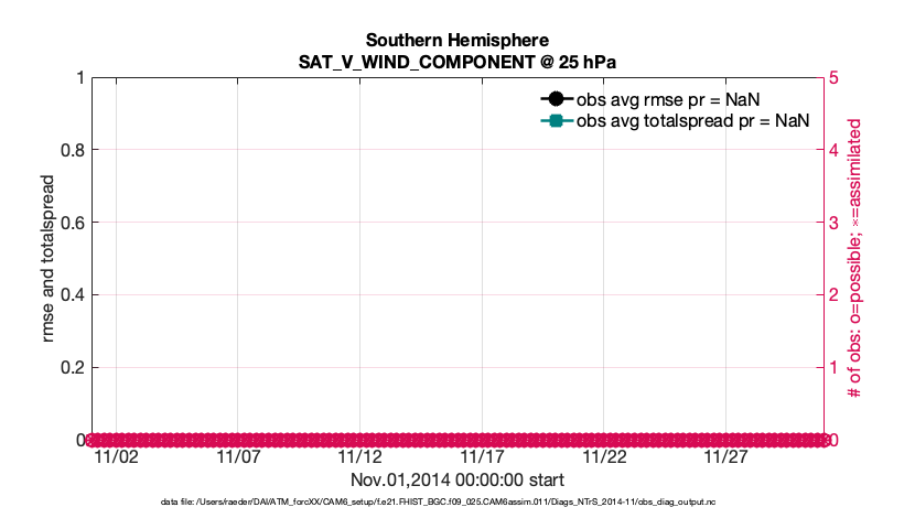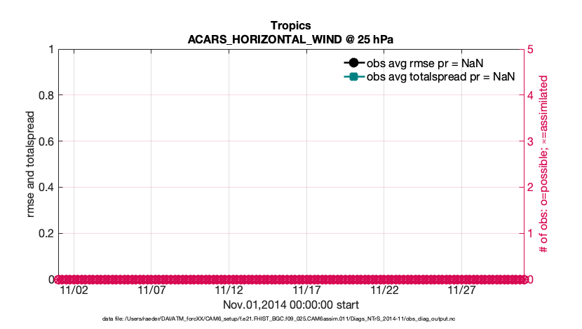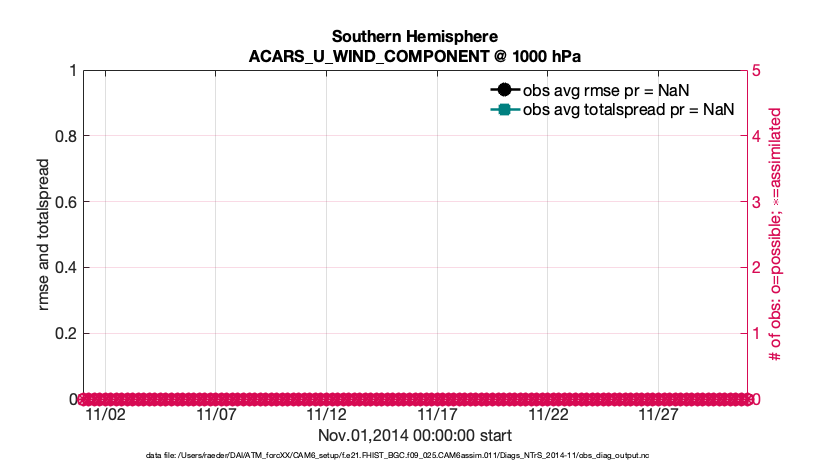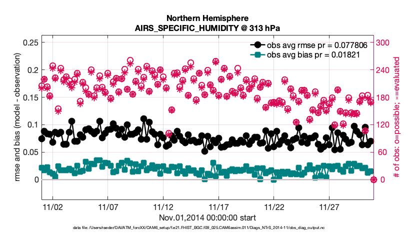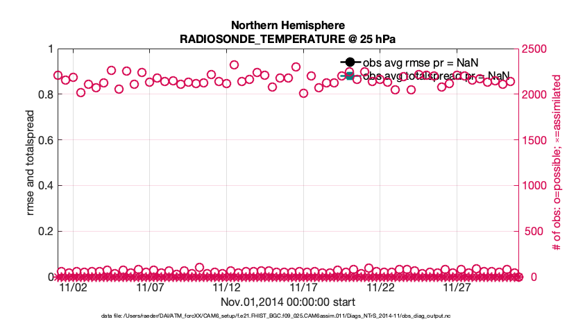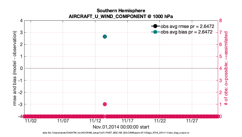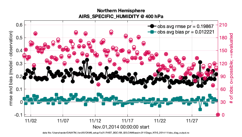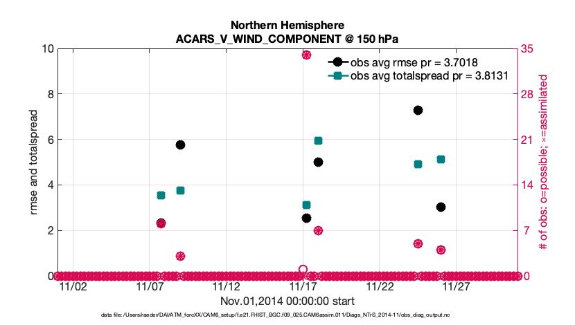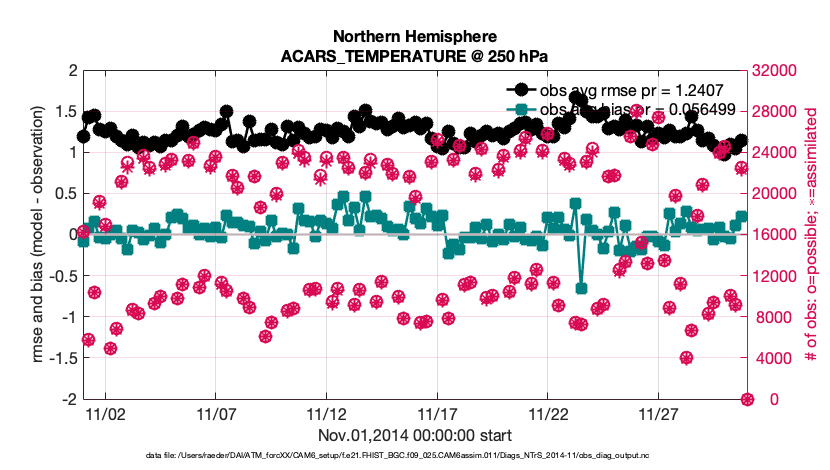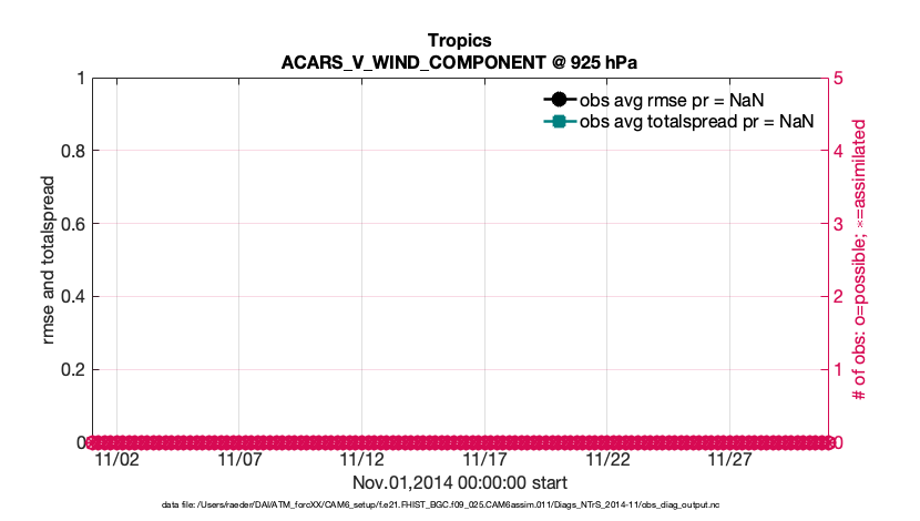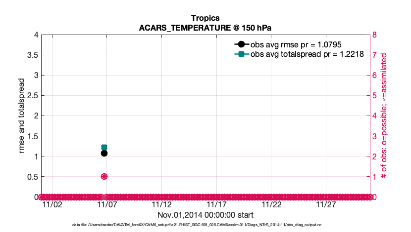 For each observation kind, the root-mean-squared-error (RMSE) is plotted together with: (i) BIAS and (ii) TOTALSPREAD. The number of available, assimilated (evaluated) and rejected observations are also shown on the plots.