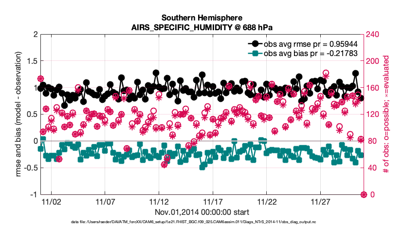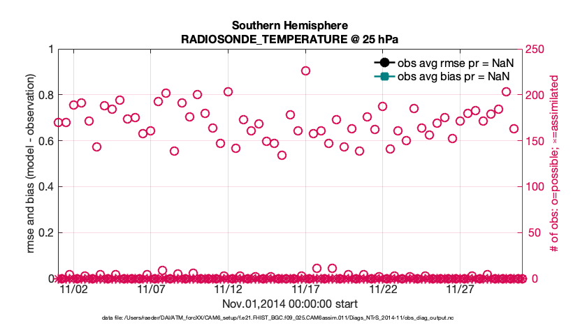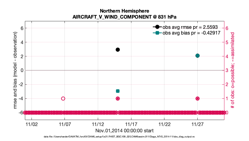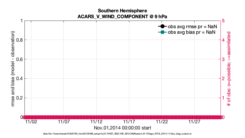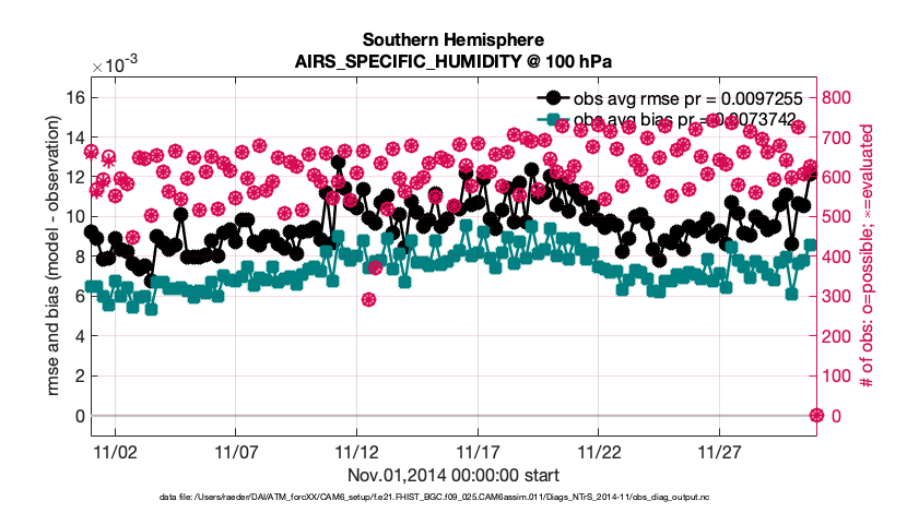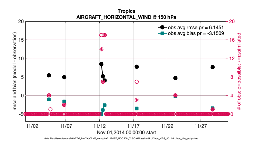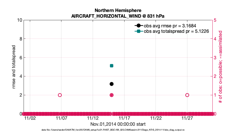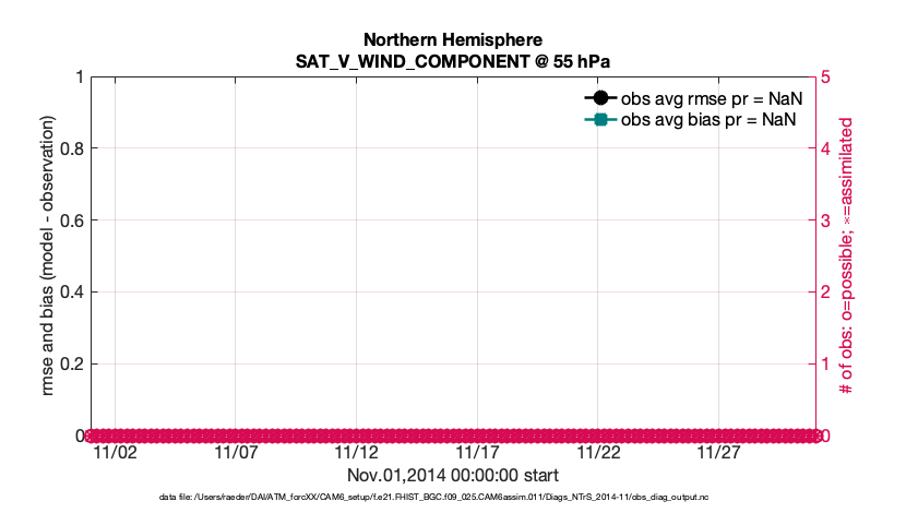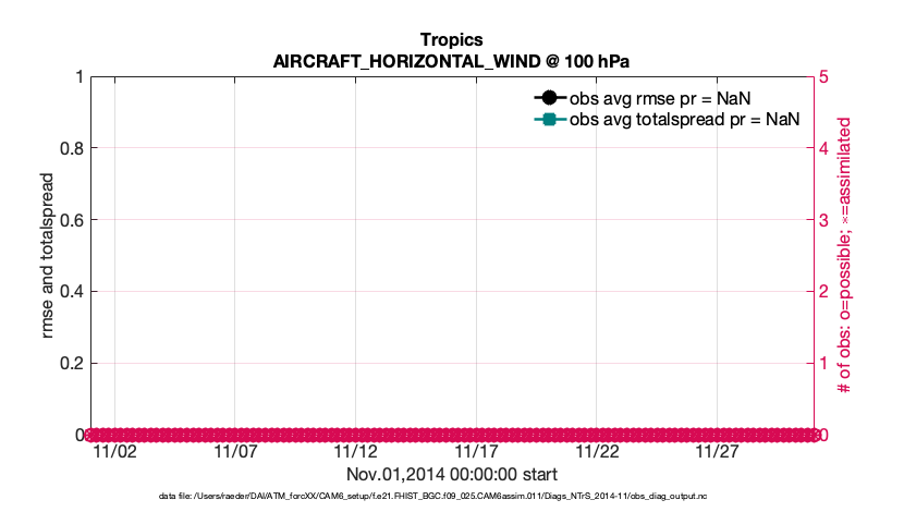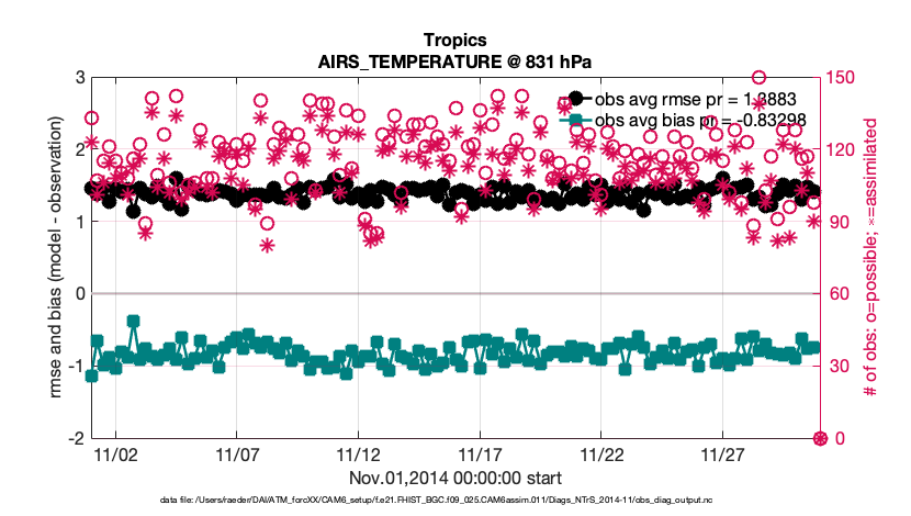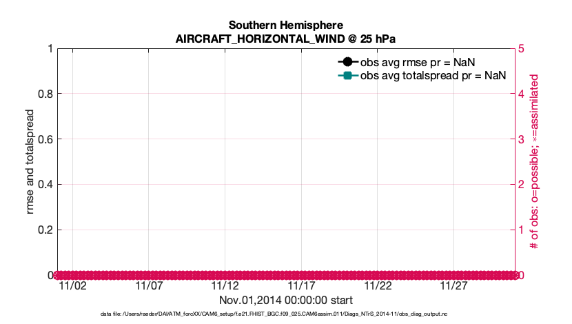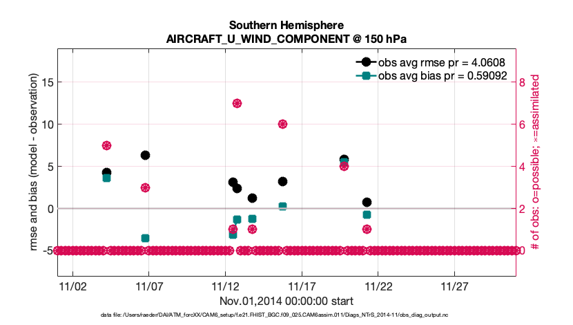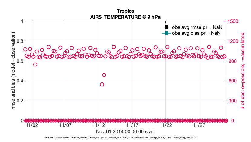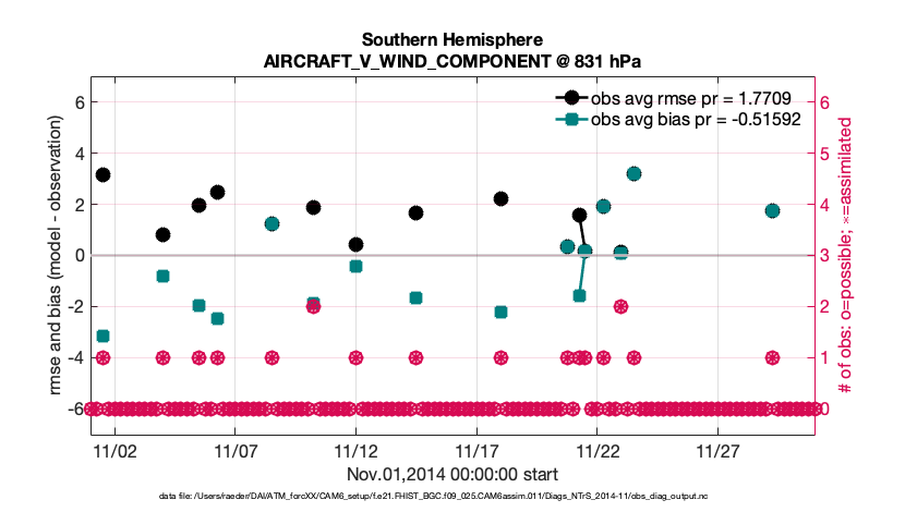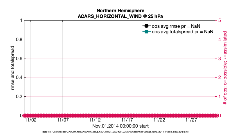 For each observation kind, the root-mean-squared-error (RMSE) is plotted together with: (i) BIAS and (ii) TOTALSPREAD. The number of available, assimilated (evaluated) and rejected observations are also shown on the plots.